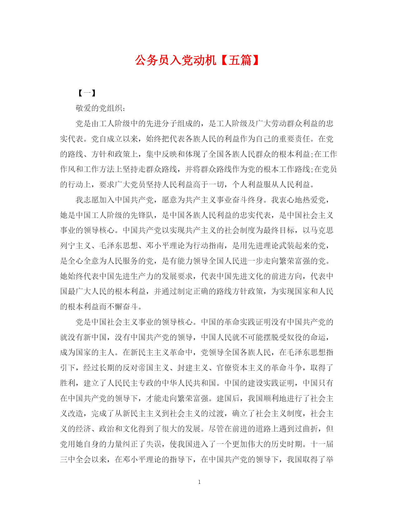 此资料由网络收集而来,如有侵权请告知上传者立即删除。资料共分享,我们负责传递知识。PAGEPAGE9公务员入党动机【五篇】【一】敬爱的党组织:党是由工人阶级中的先进分子组成的,是工人阶级及广大劳动群众利益的忠实代表。党自成立以来,始终把代表各族人民的利益作为自己的重要责任。在党的路线、方针和政策上,集中反映和体现了全国各族人民群众的根本利益;在工作作风和工作方法上坚持走群众路线,并将群众路线作为党的根本工作路线;在党员的行动上,要求广大党员坚持人民利益高于一切,个人利益服从人民利益。我志愿加入