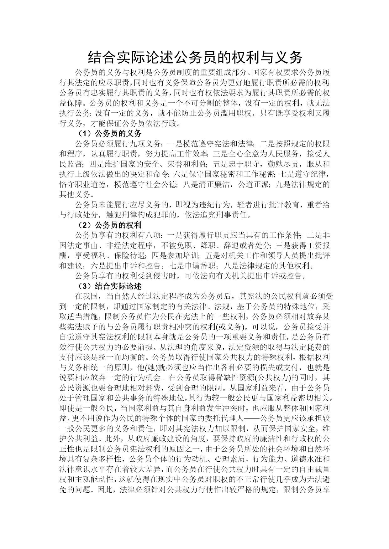 结合实际论述公务员的权利与义务公务员的义务与权利是公务员制度的重要组成部分。国家有权要求公务员履行其法定的应尽职责,同时也有义务保障公务员为更好地履行职责所必需的权利;公务员有忠实履行其职责的义务,同时也有权依法要求为履行其职责所必需的权益保障。公务员的权利和义务是一个不可分割的整体,没有一定的权利,就无法执行公务;没有一定的义务,就不能防止公务员滥用职权。只有既享受权利又履行义务,才能保证公务员依法行政。(1)公务员的义务公务员必须履行九项义务:一是模范遵守宪法和法律;二是按照规定的权限和程序,认真履行