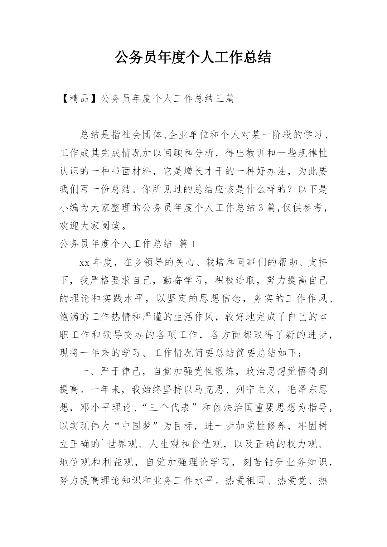 公务员年度个人工作总结【精品】公务员年度个人工作总结三篇总结是指社会团体、企业单位和个人对某一阶段的学习、工作或其完成情况加以回顾和分析,得出教训和一些规律性认识的一种书面材料,它是增长才干的一种好办法,为此要我们写一份总结。你所见过的总结应该是什么样的?以下是小编为大家整理的公务员年度个人工作总结3篇,仅供参考,欢迎大家阅读。公务员年度个人工作总结篇1xx年度,在乡领导的关心、栽培和同事们的帮助、支持下,我严格要求自己,勤奋学习,积极进取,努力提高自己的理论和实践水平,以坚定的思想信念,务实的工作作风、