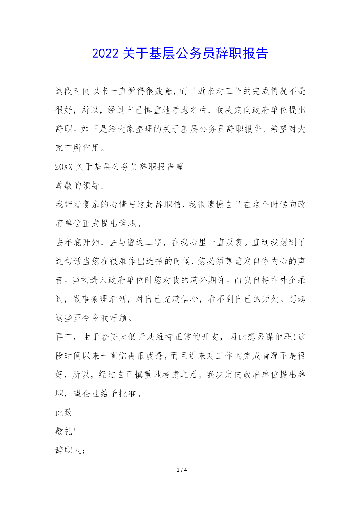 PAGE4/NUMPAGES42022关于基层公务员辞职报告这段时间以来一直觉得很疲惫,而且近来对工作的完成情况不是很好,所以,经过自己慎重地考虑之后,我决定向政府单位提出辞职。如下是给大家整理的关于基层公务员辞职报告,希望对大家有所作用。20XX关于基层公务员辞职报告篇尊敬的领导:我带着复杂的心情写这封辞职信,我很遗憾自己在这个时候向政府单位正式提出辞职。去年底开始,去与留这二字,在我心里一直反复。直到我想到了这句话当您在很难作出选择的时候,您必须尊重发自你内心的声音。当初进入政府单位时您对