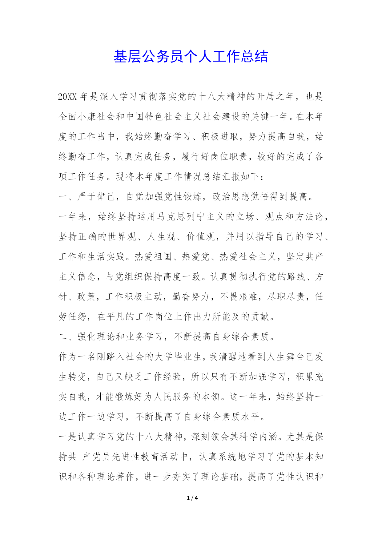 PAGE4/NUMPAGES4基层公务员个人工作总结20XX年是深入学习贯彻落实党的十八大精神的开局之年,也是全面小康社会和中国特色社会主义社会建设的关键一年。在本年度的工作当中,我始终勤奋学习、积极进取,努力提高自我,始终勤奋工作,认真完成任务,履行好岗位职责,较好的完成了各项工作任务。现将本年度工作情况总结汇报如下:一、严于律己,自觉加强党性锻炼,政治思想觉悟得到提高。一年来,始终坚持运用马克思列宁主义的立场、观点和方法论,坚持正确的世界观、人生观、价值观,并用以指导自己的学习、工作和生活