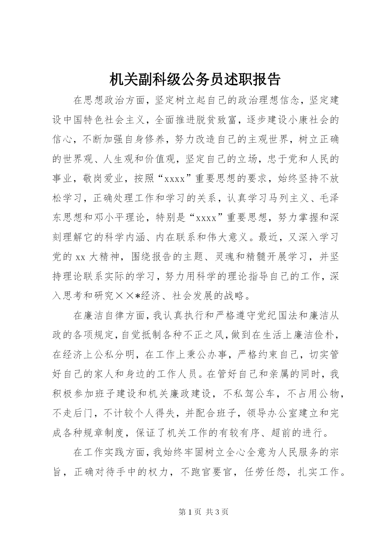 第PAGE\*Arabic\*MERGEFORMAT3页共NUMPAGES\*MERGEFORMAT3页机关副科级公务员述职报告在思想政治方面,坚定树立起自己的政治理想信念,坚定建设中国特色社会主义,全面推进脱贫致富,逐步建设小康社会的信心,不断加强自身修养,努力改造自己的主观世界,树立正确的世界观、人生观和价值观,坚定自己的立场,忠于党和人民的事业,敬岗爱业,按照“xxxx”重要思想的要求,始终坚持不放松学习,正确处理工作和学习的关系,认真学习马列主义、毛泽东思想和邓小平理论,特别是“xxx