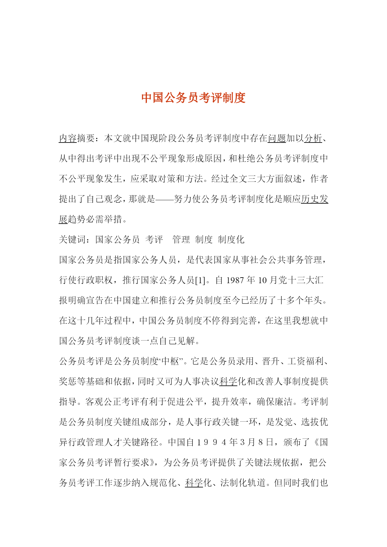 中国公务员考评制度HYPERLINK""内容摘要:本文就中国现阶段公务员考评制度中存在HYPERLINK""问题加以HYPERLINK""分析、从中得出考评中出现不公平现象形成原因,和杜绝公务员考评制度中不公平现象发生,应采取对策和方法。经过全文三大方面叙述,作者提出了自己观念,那就是——努力使公务员考评制度化是顺应HYPERLINK""历史HYPERLINK""发展趋势必需举措。关键词:国家公务员考评管理制度制度化国家公务员是指国家公务人员,是代表国家从事社会公共事务管理,