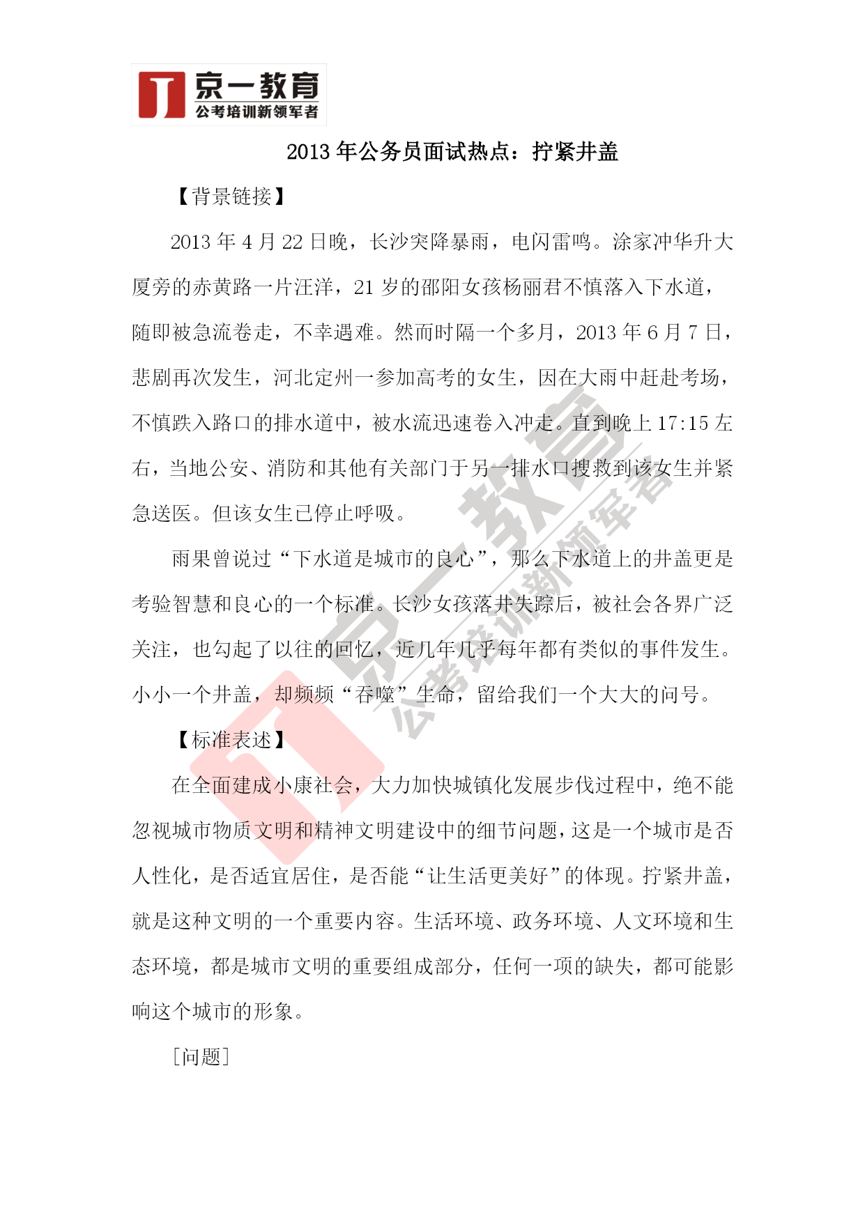 2013年公务员面试热点:拧紧井盖【背景链接】2013年4月22日晚,长沙突降暴雨,电闪雷鸣。涂家冲华升大厦旁的赤黄路一片汪洋,21岁的邵阳女孩杨丽君不慎落入下水道,随即被急流卷走,不幸遇难。然而时隔一个多月,2013年6月7日,悲剧再次发生,河北定州一参加高考的女生,因在大雨中赶赴考场,不慎跌入路口的排水道中,被水流迅速卷入冲走。直到晚上17:15左右,当地公安、消防和其他有关部门于另一排水口搜救到该女生并紧急送医。但该女生已停止呼吸。雨果曾说过“下水道是城市的良心”,那么下水道上的井盖更是考验智慧和良