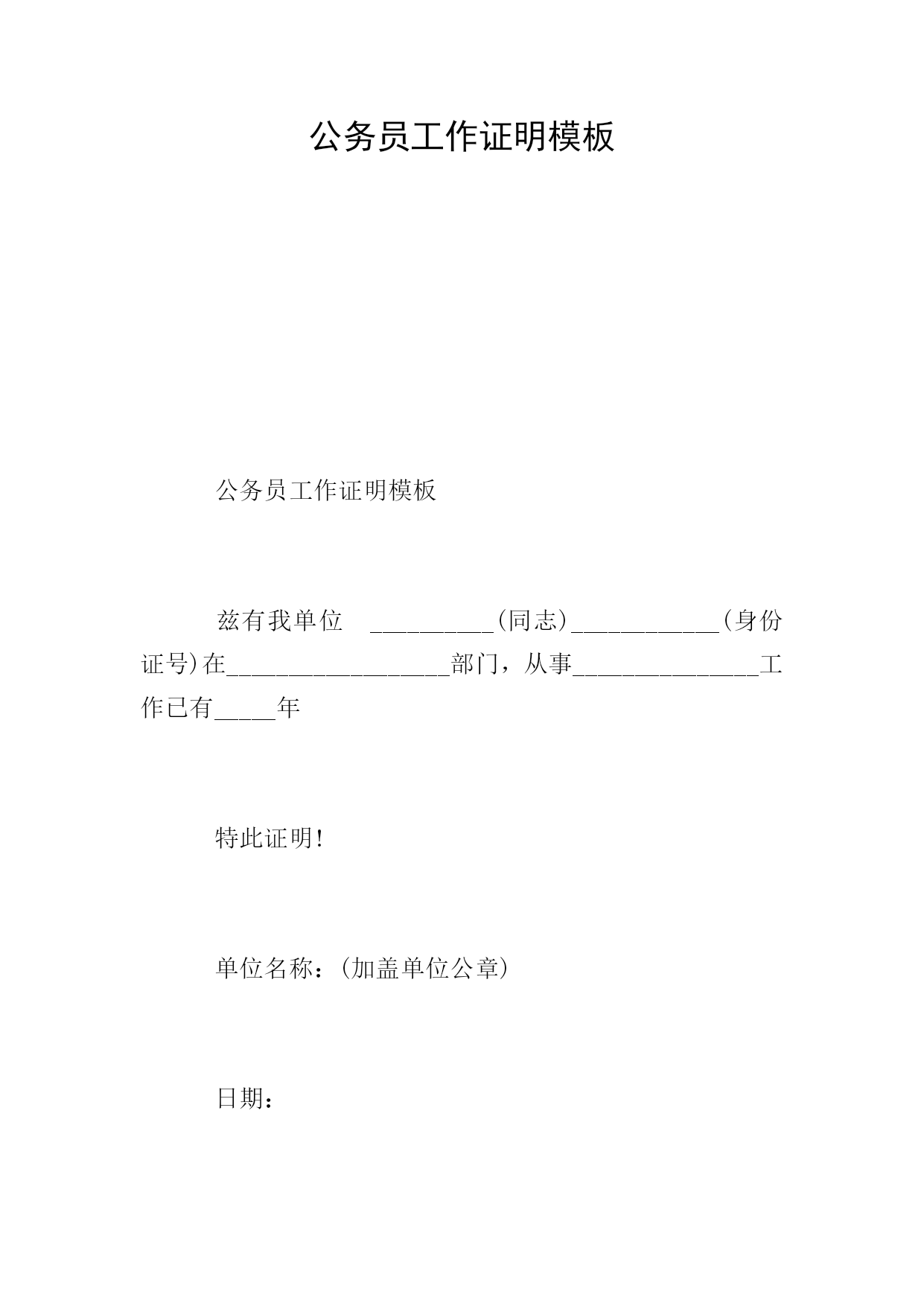 公务员工作证明模板公务员工作证明模板兹有我单位__________(同志)____________(身份证号)在__________________部门,从事_______________工作已有_____年特此证明!单位名称:(加盖单位公章)日期:公务员工作证明XX市委组织部:×××同志,身份证号:×××,系我单位在职人员,其人事档案现在×××保管。经研究,同意其报考XXXX。特此证明。(盖章)年月日公务员工作证明范本xxx人力资源和社会保障局:兹证明,本单位___________同志,男,于_____