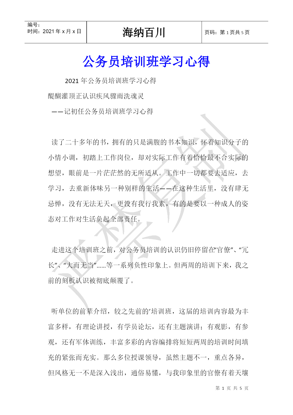 编号:时间:2021年x月x日海纳百川页码:第PAGE5页共NUMPAGES5页第PAGE\*MERGEFORMAT5页共NUMPAGES\*MERGEFORMAT5页公务员培训班学习心得2021年公务员培训班学习心得醍醐灌顶正认识疾风骤雨洗魂灵——记初任公务员培训班学习心得读了二十多年的书,拥有的只是满腹的书本知识,怀着知识分子的小情小调,初踏上工作岗位,却对实际工作有着恰恰最不合实际的想望,眼前是一片茫茫然的无所适从。工作中一切都要去适应,去学习,去重新体味另一种别样的生活——