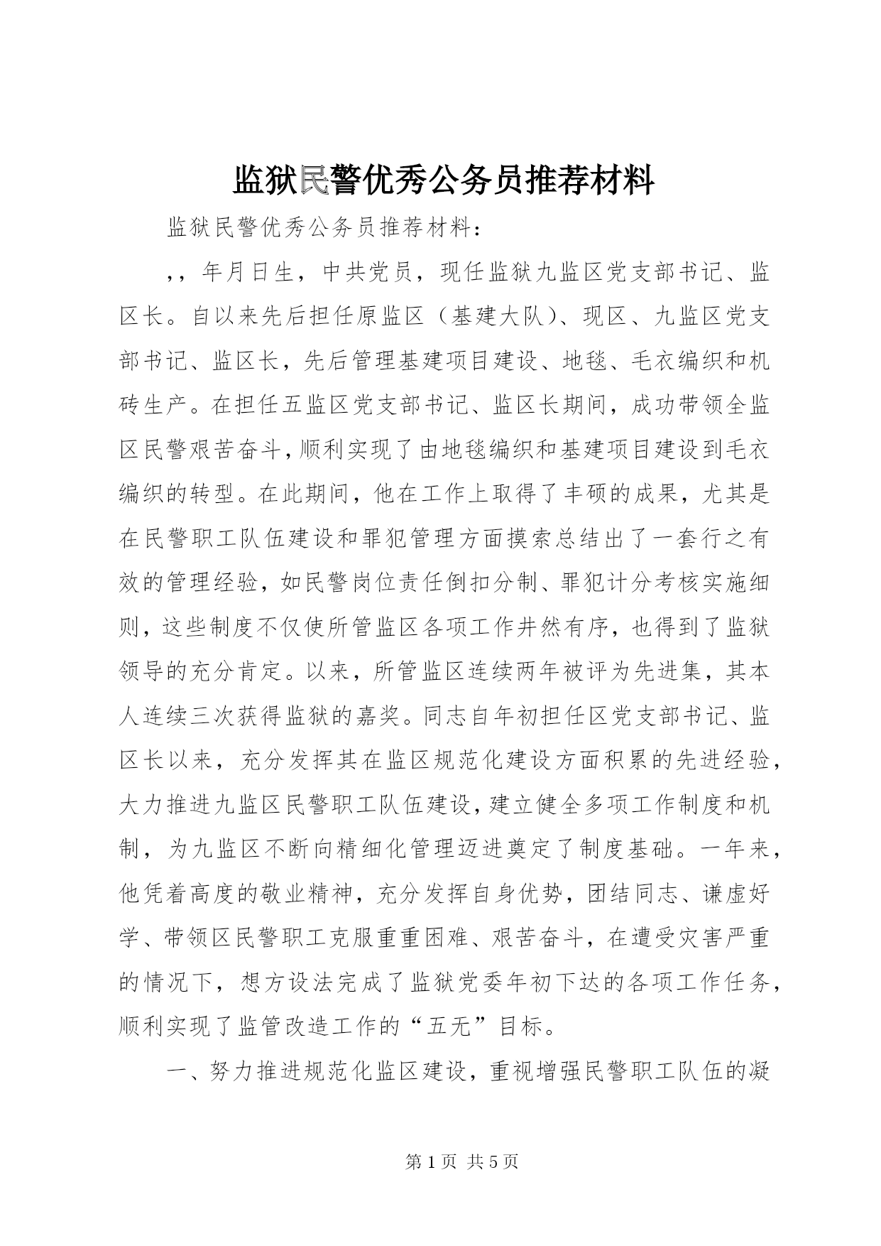 第PAGE\*Arabic\*MERGEFORMAT5页共NUMPAGES\*MERGEFORMAT5页监狱民警优秀公务员推荐材料监狱民警优秀公务员推荐材料:,,年月日生,中共党员,现任监狱九监区党支部书记、监区长。自以来先后担任原监区(基建大队)、现区、九监区党支部书记、监区长,先后管理基建项目建设、地毯、毛衣编织和机砖生产。在担任五监区党支部书记、监区长期间,成功带领全监区民警艰苦奋斗,顺利实现了由地毯编织和基建项目建设到毛衣编织的转型。在此期间,他在工作上取得了丰硕的成果,尤其是在民警职