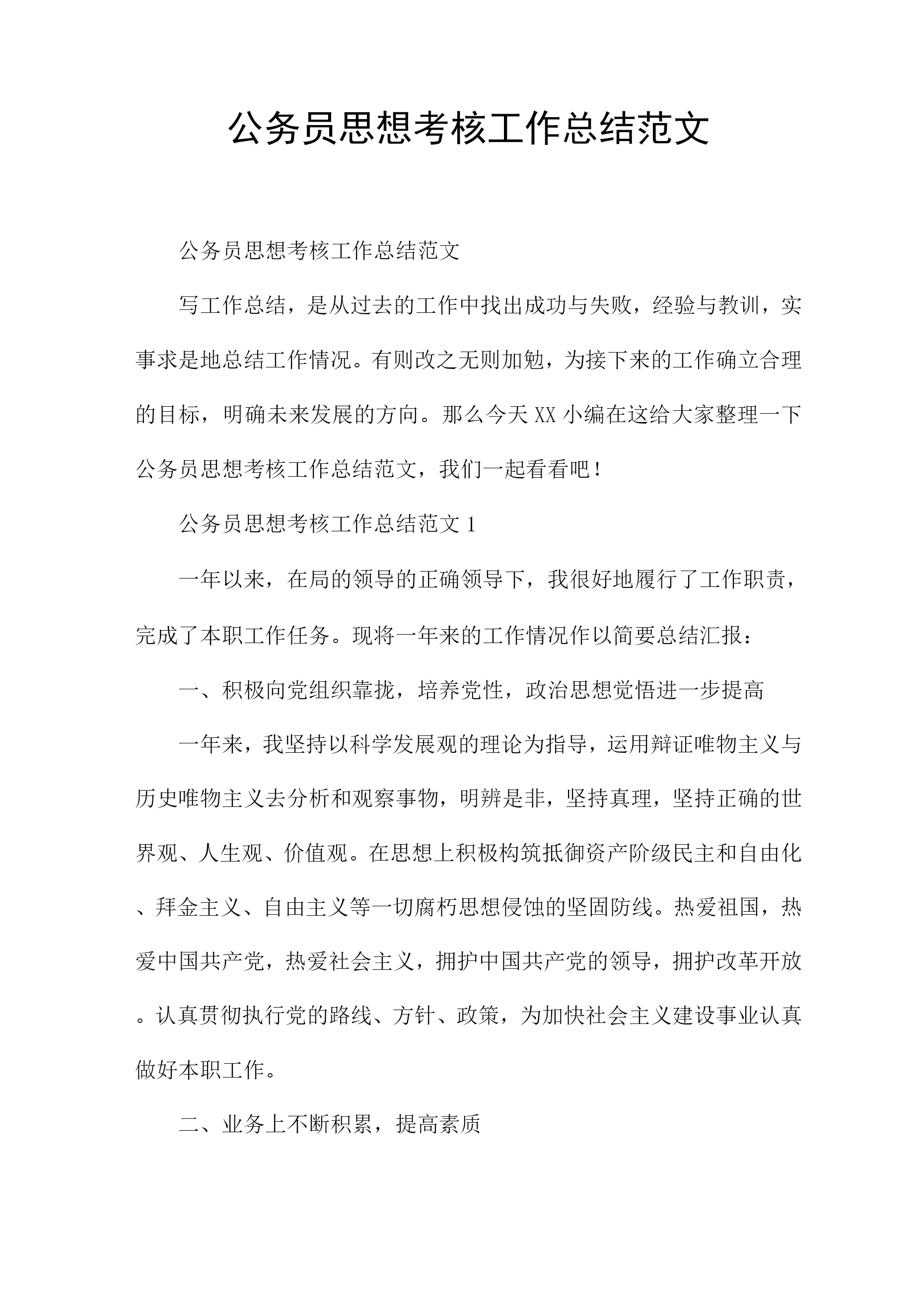 公务员思想考核工作总结范文公务员思想考核工作总结范文写工作总结,是从过去的工作中找出成功与失败,经验与教训,实事求是地总结工作情况。有则改之无则加勉,为接下来的工作确立合理的目标,明确未来发展的方向。那么今天XX小编在这给大家整理一下公务员思想考核工作总结范文,我们一起看看吧!公务员思想考核工作总结范文1一年以来,在局的领导的正确领导下,我很好地履行了工作职责,完成了本职工作任务。现将一年来的工作情况作以简要总结汇报:一、积极向党组织靠拢,培养党性,政治思想觉悟进一步提高一年来,我坚持以科学发展观的理论为