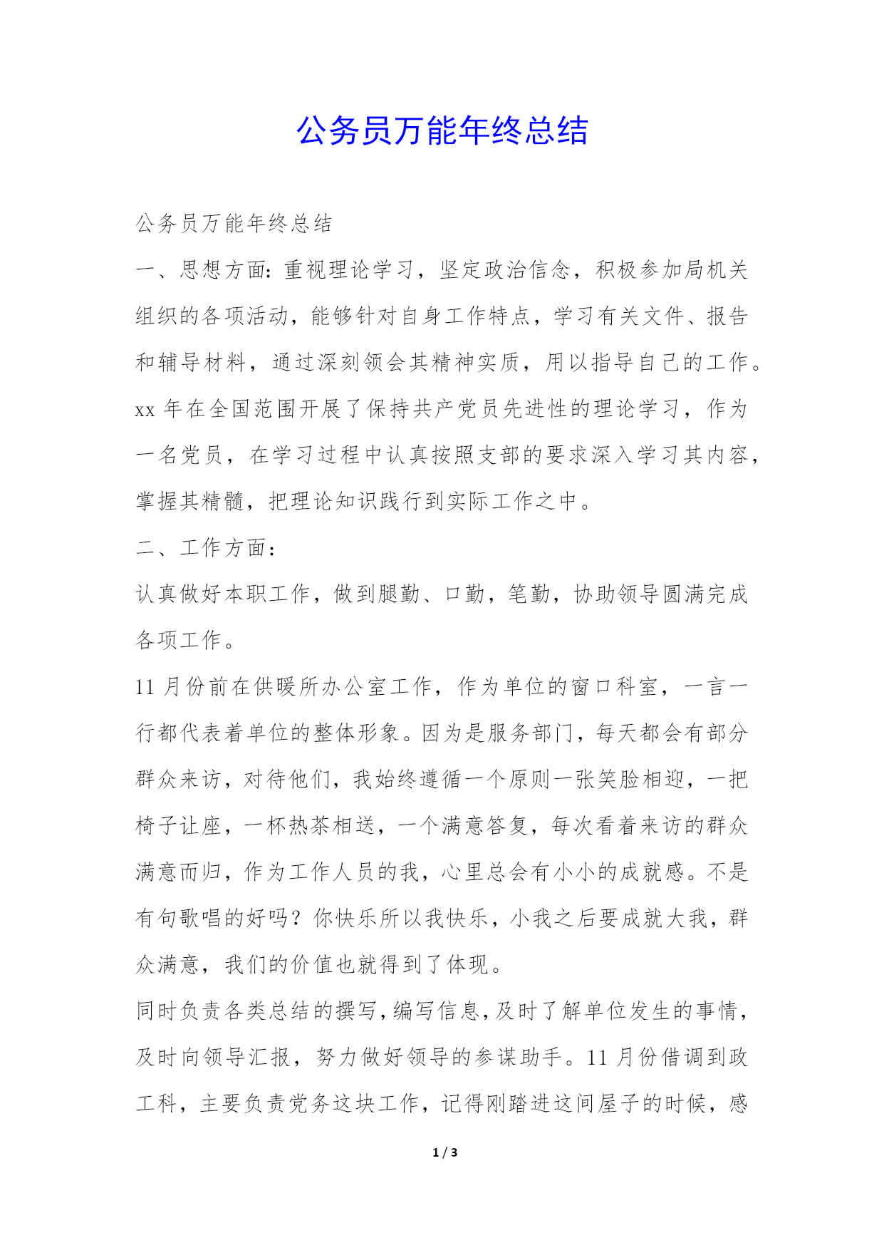 PAGE3/NUMPAGES3公务员万能年终总结公务员万能年终总结一、思想方面:重视理论学习,坚定政治信念,积极参加局机关组织的各项活动,能够针对自身工作特点,学习有关文件、报告和辅导材料,通过深刻领会其精神实质,用以指导自己的工作。xx年在全国范围开展了保持共产党员先进性的理论学习,作为一名党员,在学习过程中认真按照支部的要求深入学习其内容,掌握其精髓,把理论知识践行到实际工作之中。二、工作方面:认真做好本职工作,做到腿勤、口勤,笔勤,协助领导圆满完成各项工作。11月份前在供暖所办公室工作,
