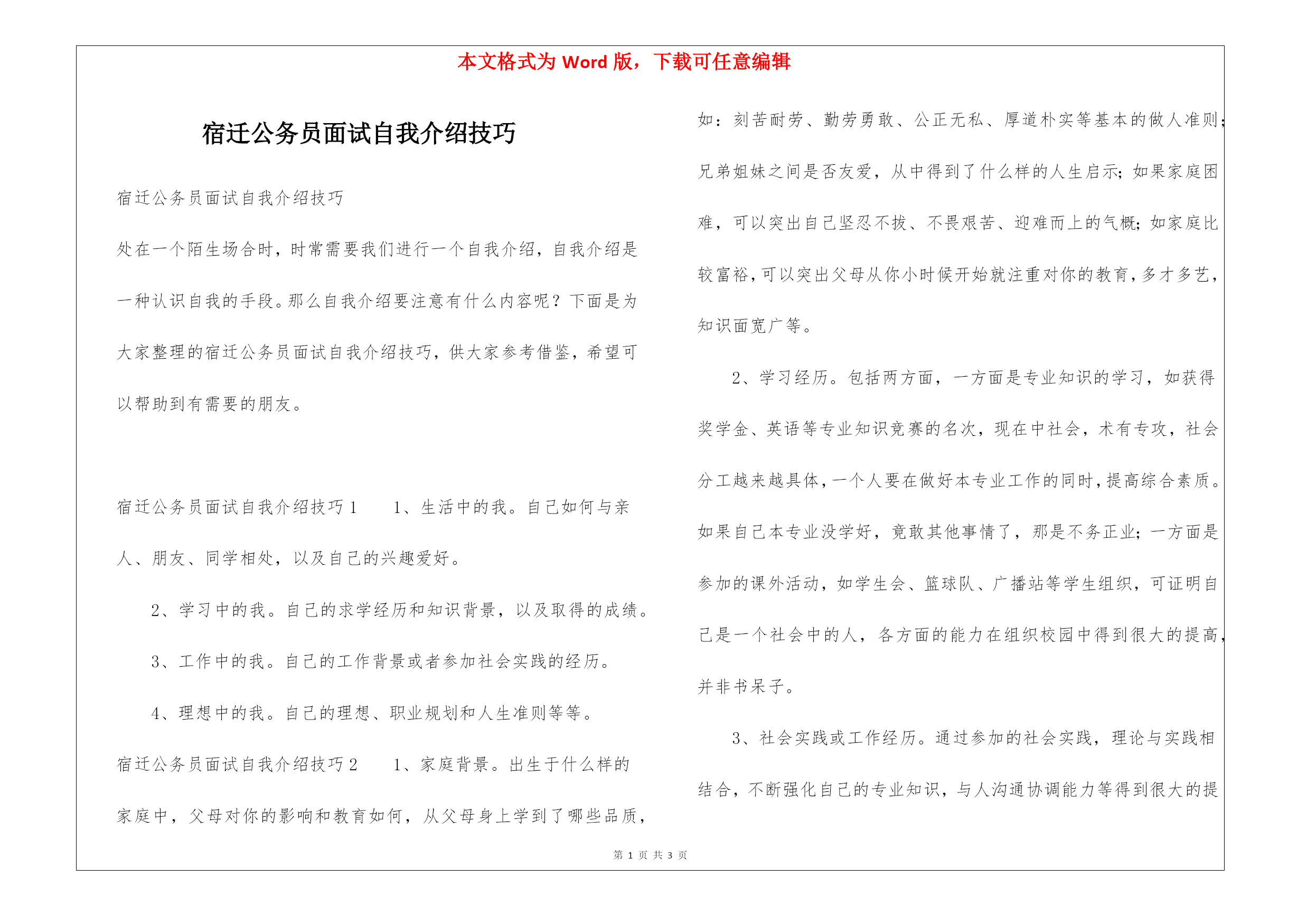 本文格式为Word版,下载可任意编辑第PAGE\*MERGEFORMAT3页共NUMPAGES\*MERGEFORMAT3页宿迁公务员面试自我介绍技巧宿迁公务员面试自我介绍技巧处在一个陌生场合时,时常需要我们进行一个自我介绍,自我介绍是一种认识自我的手段。那么自我介绍要注意有什么内容呢?下面是为大家整理的宿迁公务员面试自我介绍技巧,供大家参考借鉴,希望可以帮助到有需要的朋友。宿迁公务员面试自我介绍技巧11、生活中的我。自己如何与亲人、朋友、同学相处,以及自己的兴趣爱好。2、学习中的我。自己的求