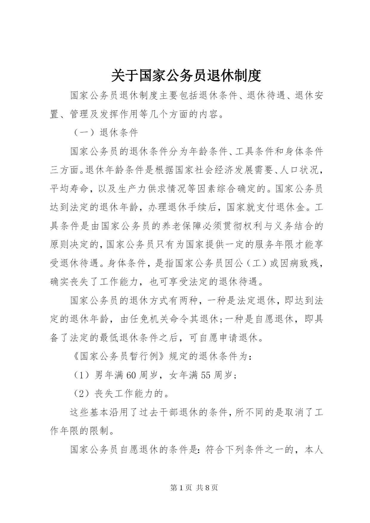 第PAGE\*Arabic\*MERGEFORMAT8页共NUMPAGES\*MERGEFORMAT8页关于国家公务员退休制度国家公务员退休制度主要包括退休条件、退休待遇、退休安置、管理及发挥作用等几个方面的内容。(一)退休条件国家公务员的退休条件分为年龄条件、工具条件和身体条件三方面。退休年龄条件是根据国家社会经济发展需要、人口状况,平均寿命,以及生产力供求情况等因素综合确定的。国家公务员达到法定的退休年龄,办理退休手续后,国家就支付退休金。工具条件是由国家公务员的养老保障必须贯彻权利与义务