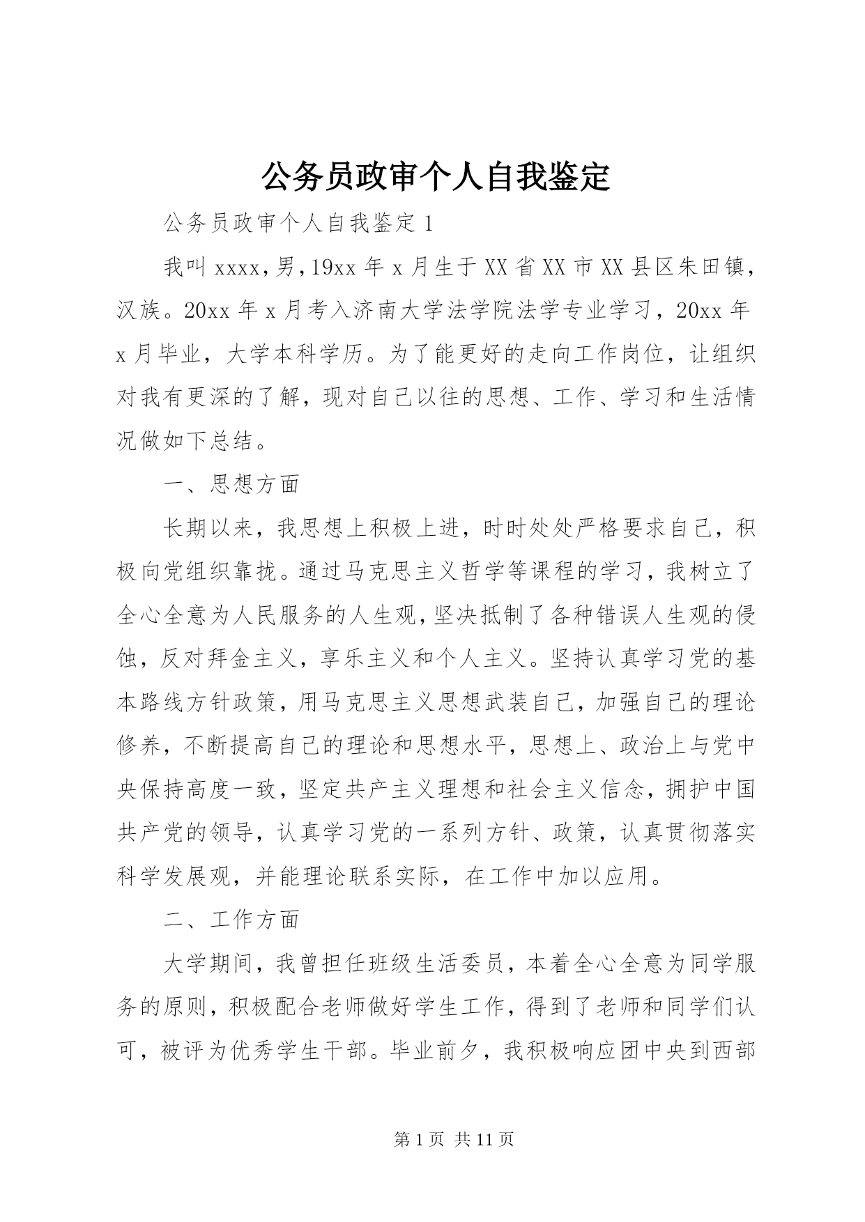 第PAGE\*Arabic\*MERGEFORMAT11页共NUMPAGES\*MERGEFORMAT11页公务员政审个人自我鉴定公务员政审个人自我鉴定1我叫xxxx,男,19xx年x月生于XX省XX市XX县区朱田镇,汉族。20xx年x月考入济南大学法学院法学专业学习,20xx年x月毕业,大学本科学历。为了能更好的走向工作岗位,让组织对我有更深的了解,现对自己以往的思想、工作、学习和生活情况做如下总结。一、思想方面长期以来,我思想上积极上进,时时处处严格要求自己,积极向党组织靠拢。通过马克思主