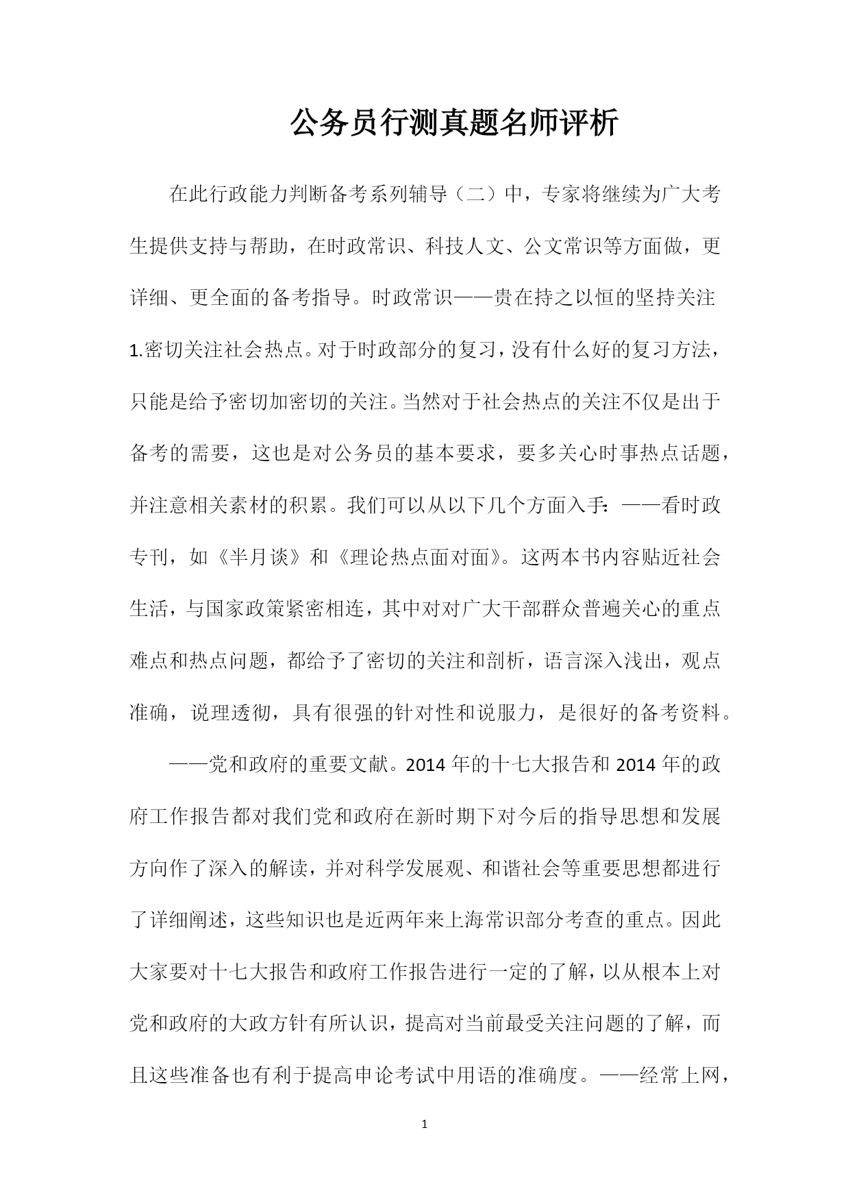 PAGEPAGE5公务员行测真题名师评析在此行政能力判断备考系列辅导(二)中,专家将继续为广大考生提供支持与帮助,在时政常识、科技人文、公文常识等方面做,更详细、更全面的备考指导。时政常识——贵在持之以恒的坚持关注1.密切关注社会热点。对于时政部分的复习,没有什么好的复习方法,只能是给予密切加密切的关注。当然对于社会热点的关注不仅是出于备考的需要,这也是对公务员的基本要求,要多关心时事热点话题,并注意相关素材的积累。我们可以从以下几个方面入手:——看时政专刊,如《半月谈》和《理论热点面对面》。