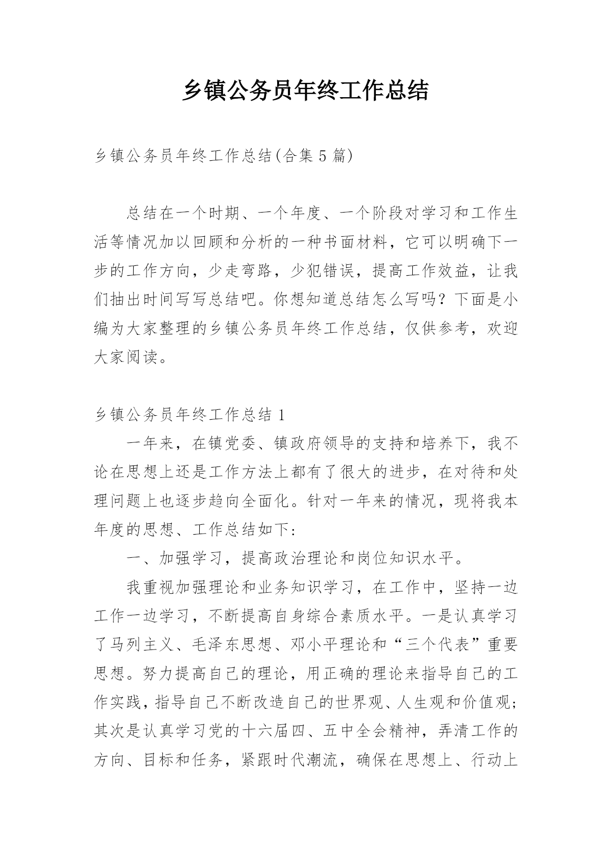 乡镇公务员年终工作总结乡镇公务员年终工作总结(合集5篇)总结在一个时期、一个年度、一个阶段对学习和工作生活等情况加以回顾和分析的一种书面材料,它可以明确下一步的工作方向,少走弯路,少犯错误,提高工作效益,让我们抽出时间写写总结吧。你想知道总结怎么写吗?下面是小编为大家整理的乡镇公务员年终工作总结,仅供参考,欢迎大家阅读。乡镇公务员年终工作总结1一年来,在镇党委、镇政府领导的支持和培养下,我不论在思想上还是工作方法上都有了很大的进步,在对待和处理问题上也逐步趋向全面化。针对一年来的情况,现将我本年度的思想、
