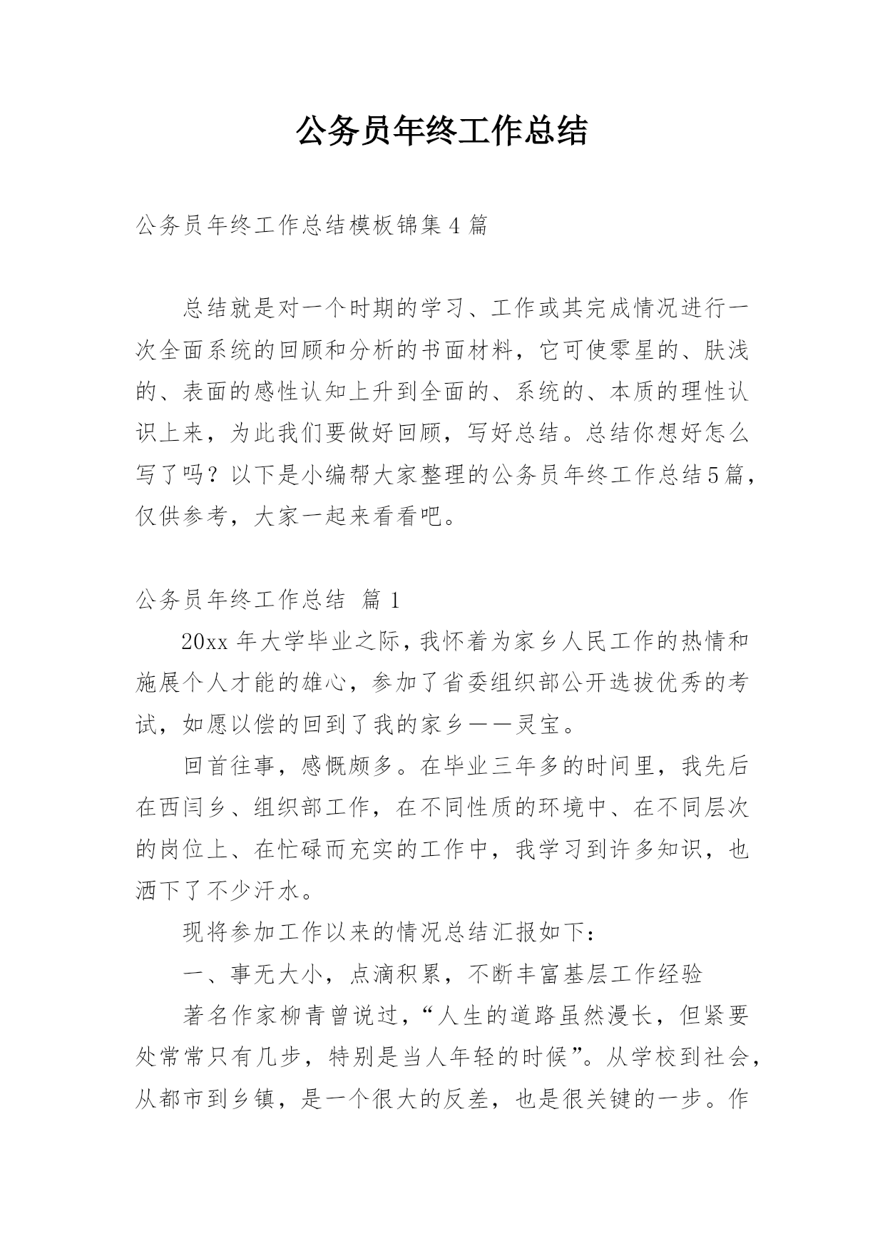 公务员年终工作总结公务员年终工作总结模板锦集4篇总结就是对一个时期的学习、工作或其完成情况进行一次全面系统的回顾和分析的书面材料,它可使零星的、肤浅的、表面的感性认知上升到全面的、系统的、本质的理性认识上来,为此我们要做好回顾,写好总结。总结你想好怎么写了吗?以下是小编帮大家整理的公务员年终工作总结5篇,仅供参考,大家一起来看看吧。公务员年终工作总结篇120xx年大学毕业之际,我怀着为家乡人民工作的热情和施展个人才能的雄心,参加了省委组织部公开选拔优秀的考试,如愿以偿的回到了我的家乡――灵宝。回首往事,感
