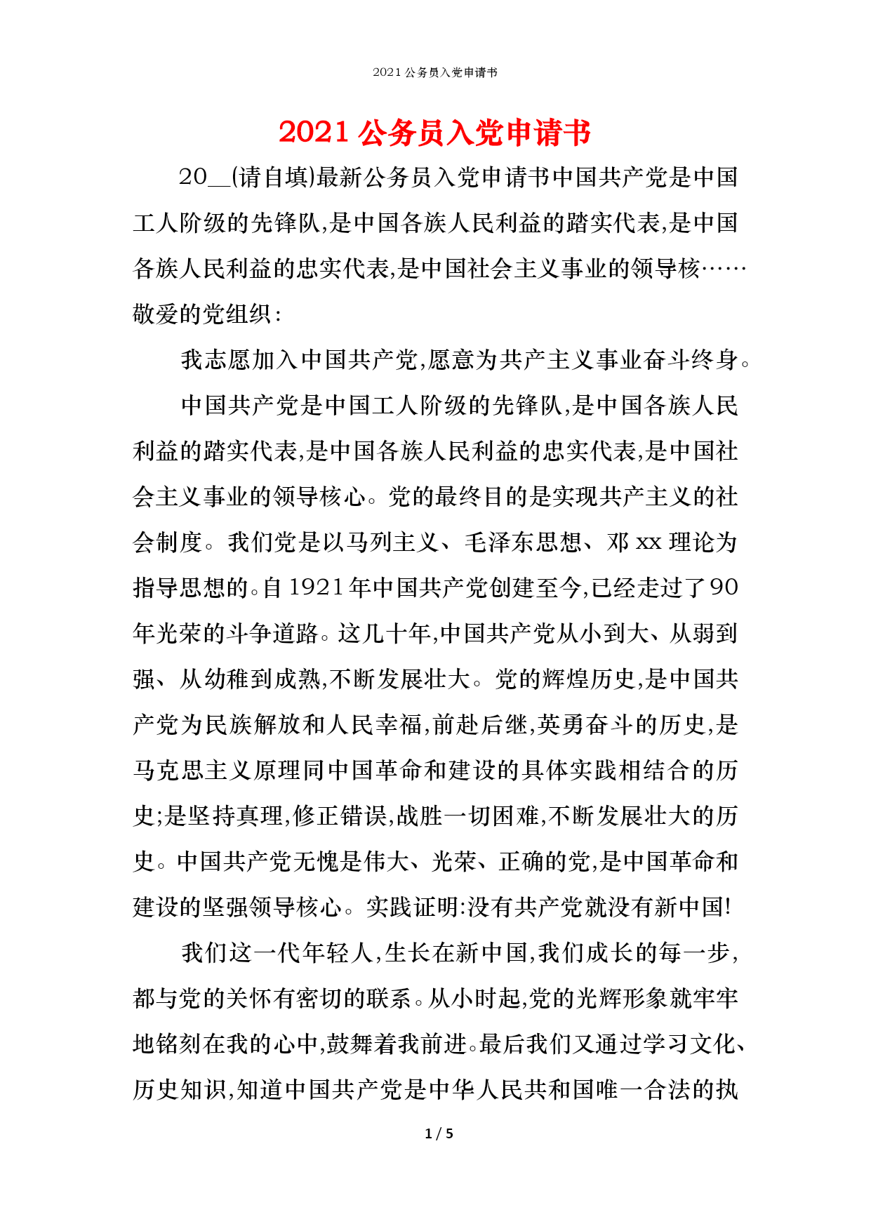 2021公务员入党申请书PAGE5/NUMPAGES52021公务员入党申请书20__(请自填)最新公务员入党申请书中国共产党是中国工人阶级的先锋队,是中国各族人民利益的踏实代表,是中国各族人民利益的忠实代表,是中国社会主义事业的领导核……敬爱的党组织:我志愿加入中国共产党,愿意为共产主义事业奋斗终身。中国共产党是中国工人阶级的先锋队,是中国各族人民利益的踏实代表,是中国各族人民利益的忠实代表,是中国社会主义事业的领导核心。党的最终目的是实现共产主义的社会制度。我们党是以马列主义、毛泽东思想、