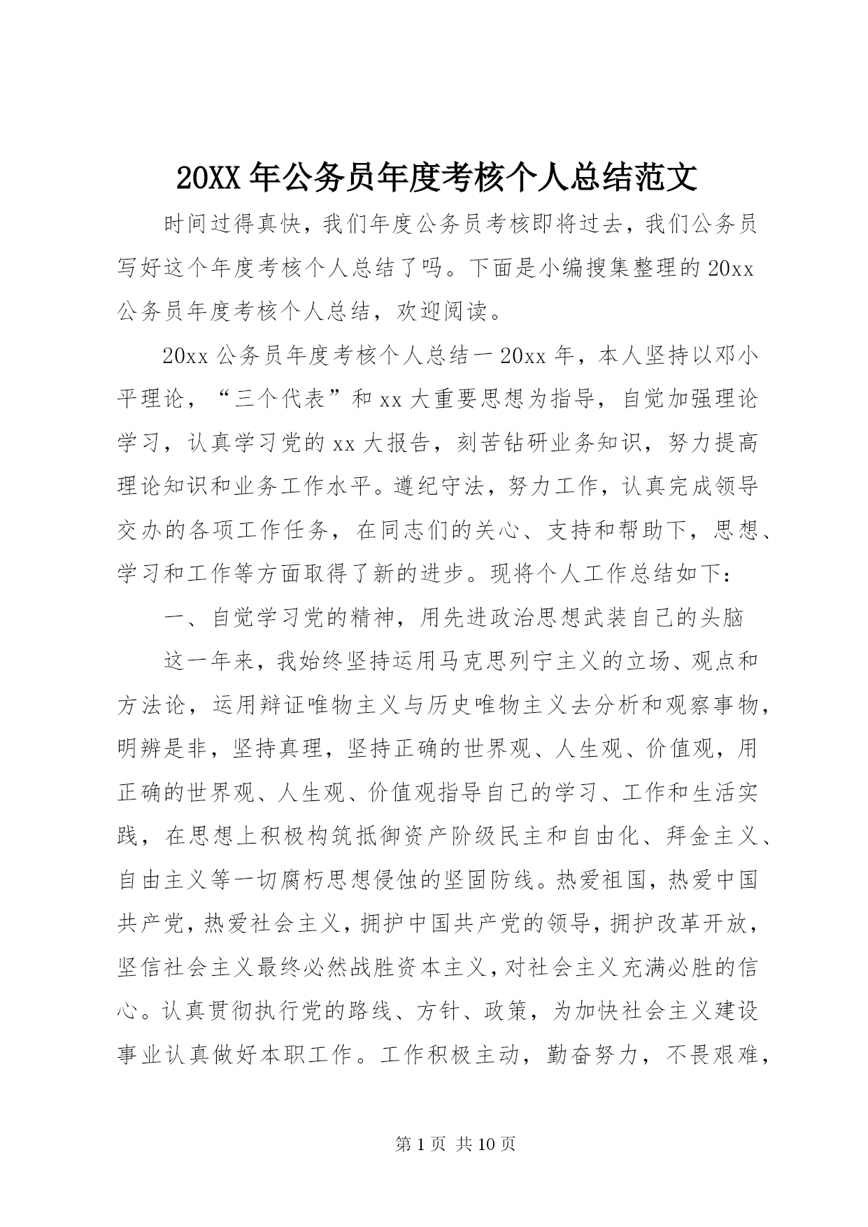 第PAGE\*Arabic\*MERGEFORMAT10页共NUMPAGES\*MERGEFORMAT10页20XX年公务员年度考核个人总结范文时间过得真快,我们年度公务员考核即将过去,我们公务员写好这个年度考核个人总结了吗。下面是小编搜集整理的20xx公务员年度考核个人总结,欢迎阅读。20xx公务员年度考核个人总结一20xx年,本人坚持以邓小平理论,“三个代表”和xx大重要思想为指导,自觉加强理论学习,认真学习党的xx大报告,刻苦钻研业务知识,努力提高理论知识和业务工作水平。遵纪守法,努力工