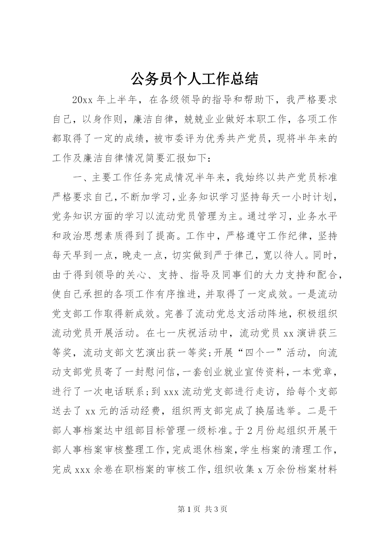 第PAGE\*Arabic\*MERGEFORMAT3页共NUMPAGES\*MERGEFORMAT3页公务员个人工作总结20xx年上半年,在各级领导的指导和帮助下,我严格要求自己,以身作则,廉洁自律,兢兢业业做好本职工作,各项工作都取得了一定的成绩,被市委评为优秀共产党员,现将半年来的工作及廉洁自律情况简要汇报如下:一、主要工作任务完成情况半年来,我始终以共产党员标准严格要求自己,不断加学习,业务知识学习坚持每天一小时计划,党务知识方面的学习以流动党员管理为主。通过学习,业务水平和政治思想素