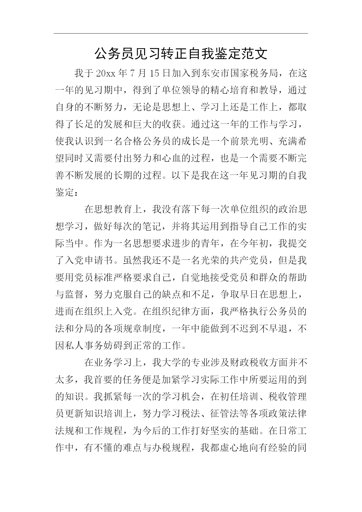 公务员见习转正自我鉴定范文我于20xx年7月15日加入到东安市国家税务局,在这一年的见习期中,得到了单位领导的精心培育和教导,通过自身的不断努力,无论是思想上、学习上还是工作上,都取得了长足的发展和巨大的收获。通过这一年的工作与学习,使我认识到一名合格公务员的成长是一个前景光明、充满希望同时又需要付出努力和心血的过程,也是一个需要不断完善不断发展的长期的过程。以下是我在这一年见习期的自我鉴定:在思想教育上,我没有落下每一次单位组织的政治思想学习,做好每次的笔记,并将其运用到指导自己工作的实际当中。作为一名