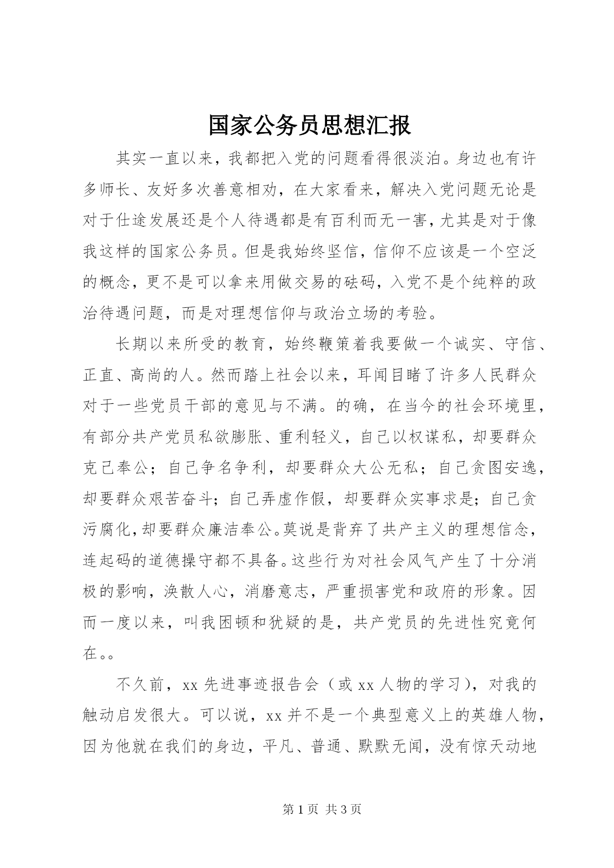 第PAGE\*Arabic\*MERGEFORMAT3页共NUMPAGES\*MERGEFORMAT3页国家公务员思想汇报其实一直以来,我都把入党的问题看得很淡泊。身边也有许多师长、友好多次善意相劝,在大家看来,解决入党问题无论是对于仕途发展还是个人待遇都是有百利而无一害,尤其是对于像我这样的国家公务员。但是我始终坚信,信仰不应该是一个空泛的概念,更不是可以拿来用做交易的砝码,入党不是个纯粹的政治待遇问题,而是对理想信仰与政治立场的考验。长期以来所受的教育,始终鞭策着我要做一个诚实、守信、正直