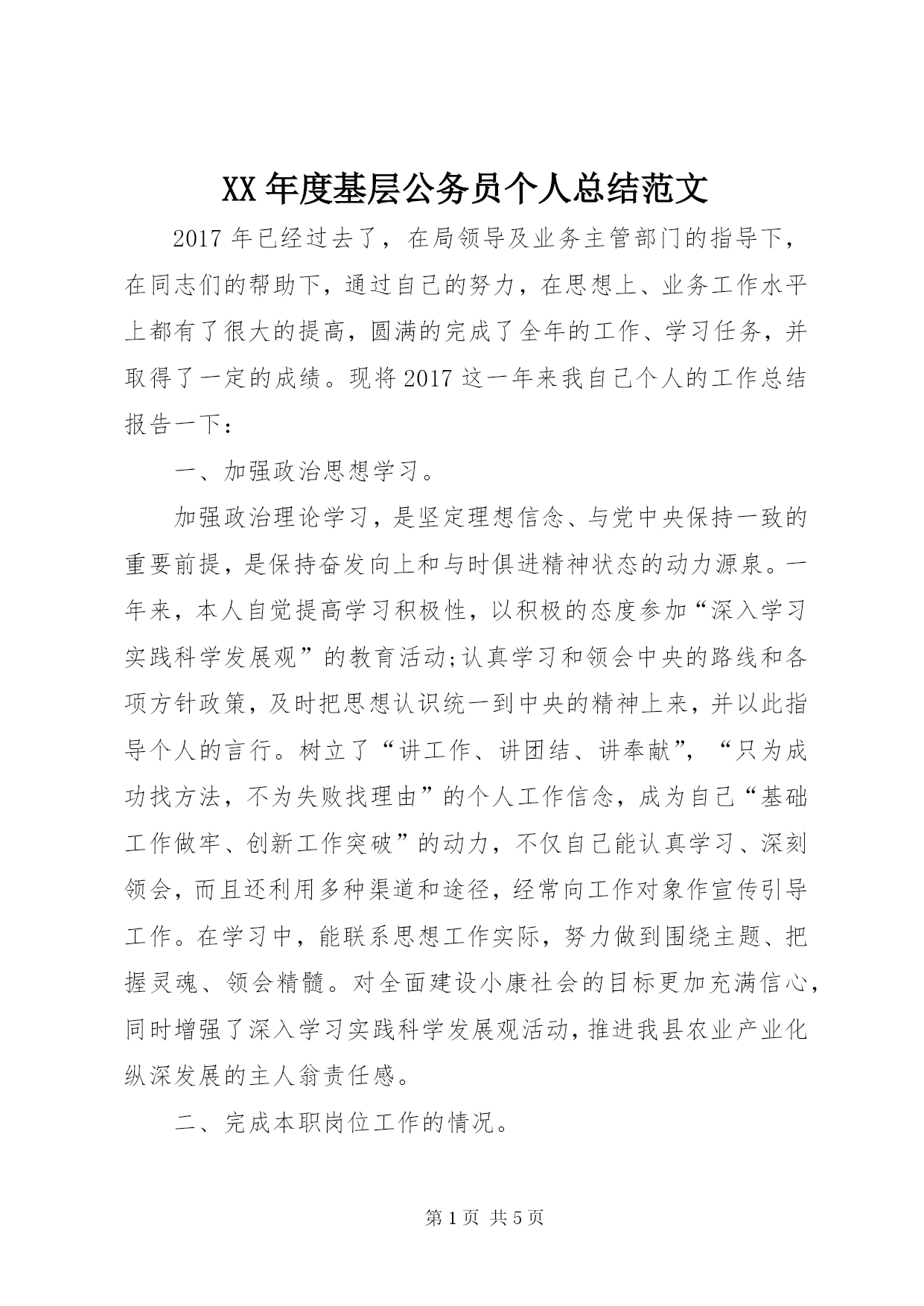 第PAGE\*Arabic\*MERGEFORMAT5页共NUMPAGES\*MERGEFORMAT5页XX年度基层公务员个人总结范文2017年已经过去了,在局领导及业务主管部门的指导下,在同志们的帮助下,通过自己的努力,在思想上、业务工作水平上都有了很大的提高,圆满的完成了全年的工作、学习任务,并取得了一定的成绩。现将2017这一年来我自己个人的工作总结报告一下:一、加强政治思想学习。加强政治理论学习,是坚定理想信念、与党中央保持一致的重要前提,是保持奋发向上和与时俱进精神状态的动力源泉。一