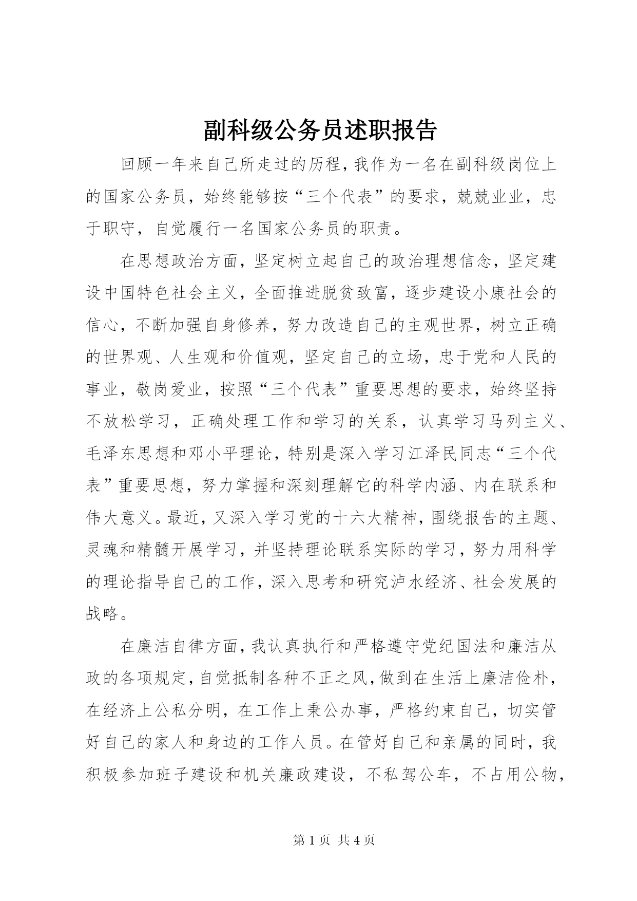 第PAGE\*Arabic\*MERGEFORMAT4页共NUMPAGES\*MERGEFORMAT4页副科级公务员述职报告回顾一年来自己所走过的历程,我作为一名在副科级岗位上的国家公务员,始终能够按“三个代表”的要求,兢兢业业,忠于职守,自觉履行一名国家公务员的职责。在思想政治方面,坚定树立起自己的政治理想信念,坚定建设中国特色社会主义,全面推进脱贫致富,逐步建设小康社会的信心,不断加强自身修养,努力改造自己的主观世界,树立正确的世界观、人生观和价值观,坚定自己的立场,忠于党和人民的事业,敬