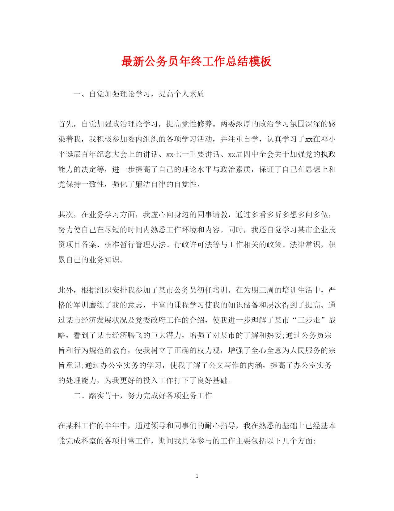 此资料由网络收集而来,如有侵权请告知上传者立即删除。资料共分享,我们负责传递知识。PAGEPAGE2最新公务员年终工作总结模板一、自觉加强理论学习,提高个人素质首先,自觉加强政治理论学习,提高党性修养。两委浓厚的政治学习氛围深深的感染着我,我积极参加委内组织的各项学习活动,并注重自学,认真学习了xx在邓小平诞辰百年纪念大会上的讲话、xx七一重要讲话、xx届四中全会关于加强党的执政能力的决定等,进一步提高了自己的理论水平与政治素质,保证了自己在思想上和党保持一致性,强化了廉洁自律的自觉性。其次,