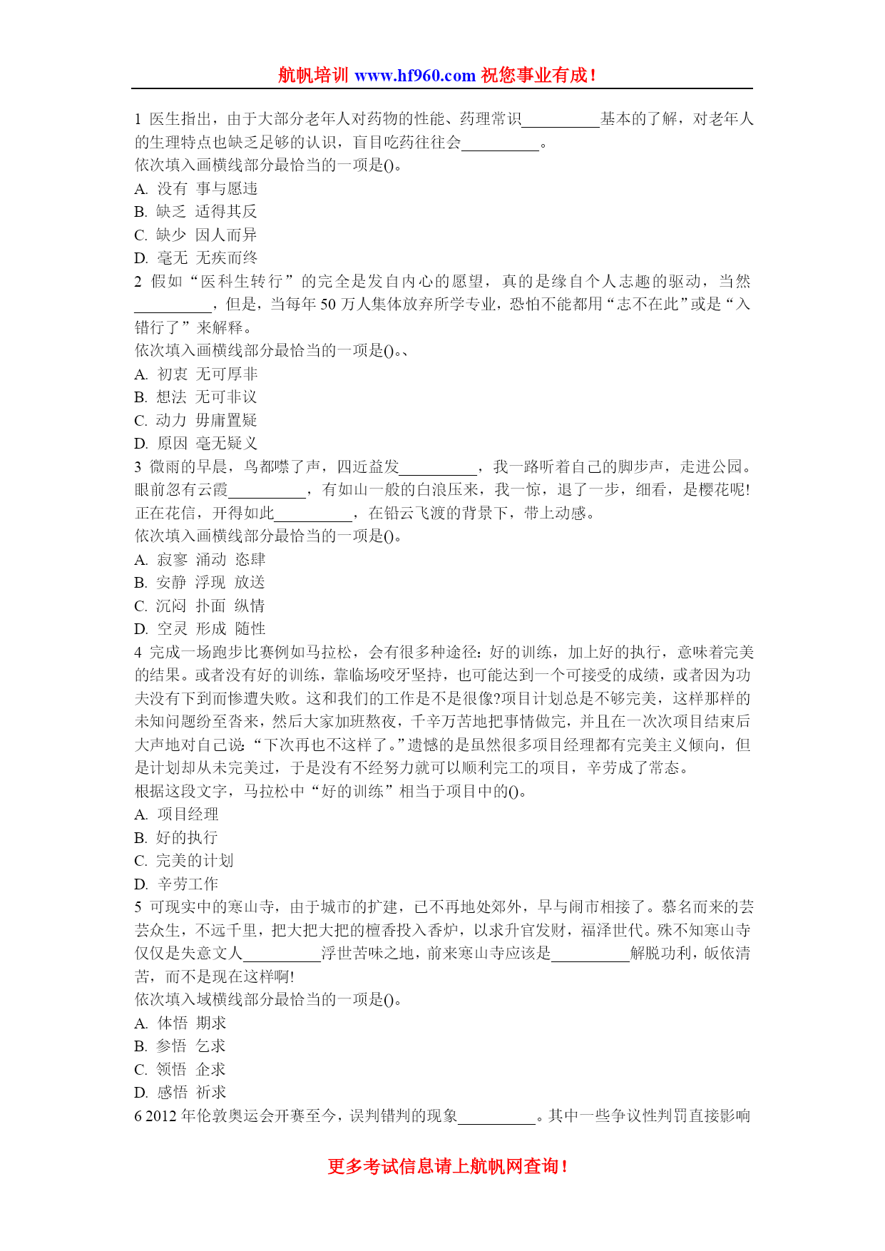 航帆培训www.hf960.com祝您事业有成!更多考试信息请上航帆网查询!1医生指出,由于大部分老年人对药物的性能、药理常识__________基本的了解,对老年人的生理特点也缺乏足够的认识,盲目吃药往往会__________。依次填入画横线部分最恰当的一项是()。A.没有事与愿违B.缺乏适得其反C.缺少因人而异D.毫无无疾而终2假如“医科生转行”的完全是发自内心的愿望,真的是缘自个人志趣的驱动,当然__________,但是,当每年50万人集体放弃所学专业,恐怕不能都用“志不在此”或是“入错行了”来解