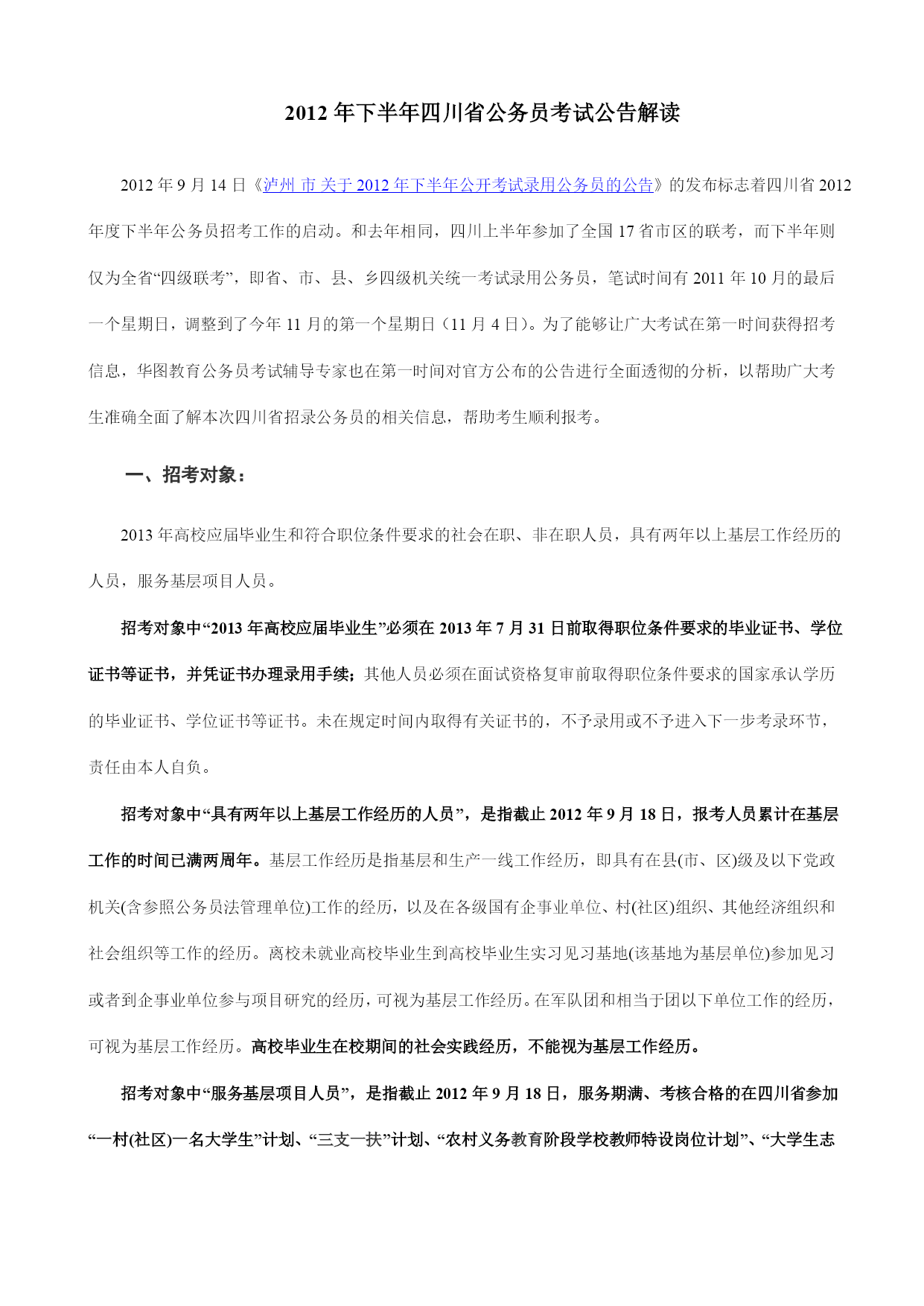 2012年下半年四川省公务员考试公告解读2012年9月14日《HYPERLINK"http://sichuan.htexam.com/2012/0914/366231.html"泸州市关于2012年下半年公开考试录用公务员的公告》的发布标志着四川省2012年度下半年公务员招考工作的启动。和去年相同,四川上半年参加了全国17省市区的联考,而下半年则仅为全省“四级联考”,即省、市、县、乡四级机关统一考试录用公务员,笔试时间有2011年10月的最后一个星期日,调整到了今年11月的第一个星期日(11月4日)