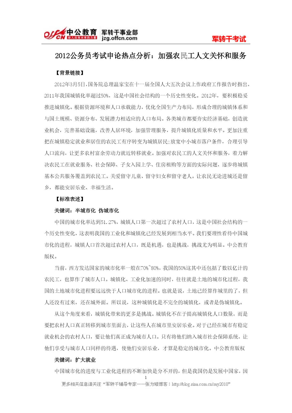 军转干考试PAGEPAGE22012公务员考试申论热点分析:加强农民工人文关怀和服务【背景链接】2012年3月5日,国务院总理温家宝在十一届全国人大五次会议上作政府工作报告时指出,2011年我国城镇化率超过50%,这是中国社会结构的一个历史性变化。2012年,要积极稳妥推进城镇化。根据资源环境和人口承载能力,优化全国生产力布局,形成合理的城镇体系和与国土规模、资源分布、发展潜力相适应的人口布局。各类城市都要夯实经济基础,创造就业机会,完善基础设施,改善人居环境,加强管理服务,提升城镇化质量和水