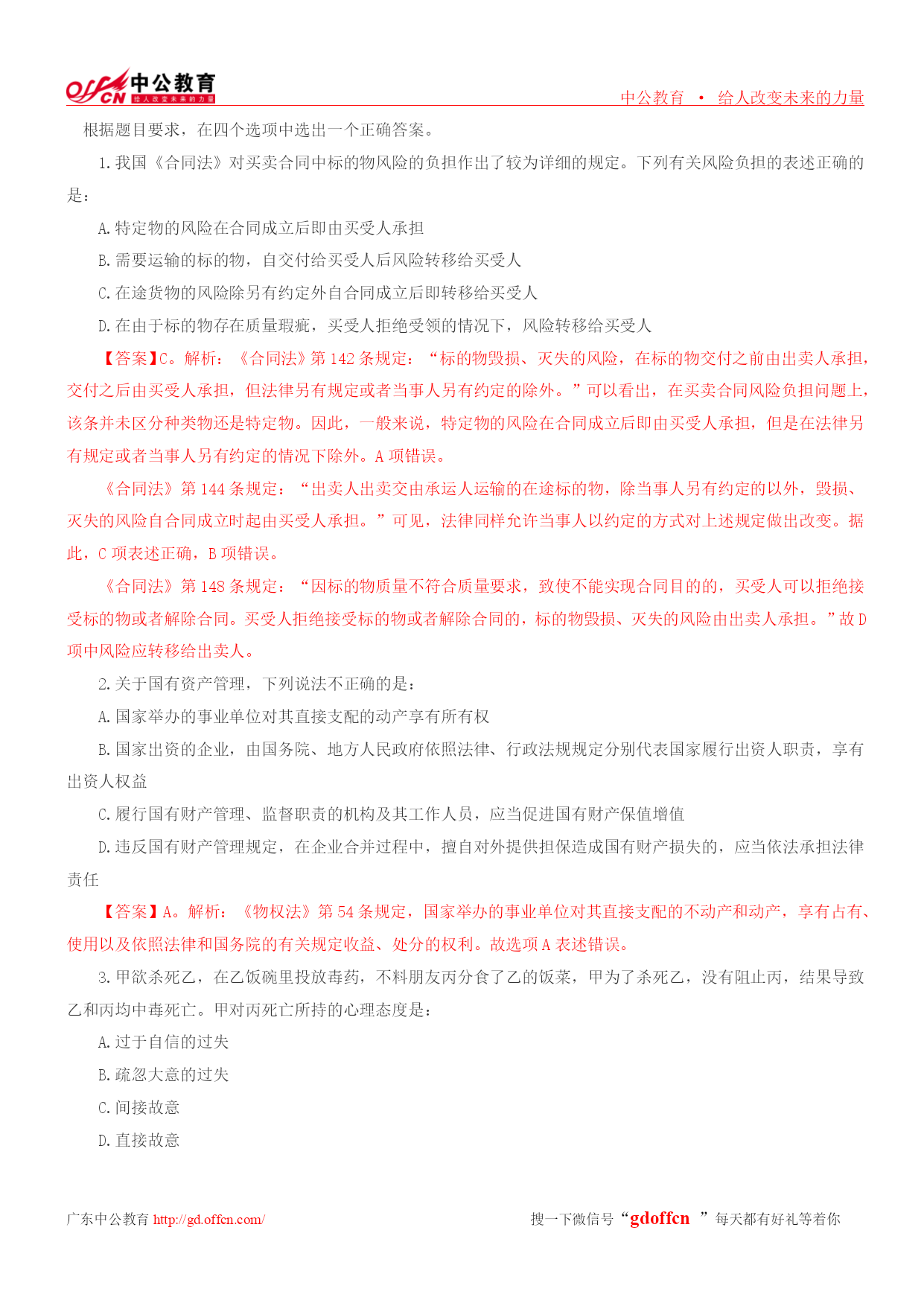 中公教育·给人改变未来的力量广东中公教育http://gd.offcn.com/搜一下微信号“gdoffcn”每天都有好礼等着你根据题目要求,在四个选项中选出一个正确答案。1.我国《合同法》对买卖合同中标的物风险的负担作出了较为详细的规定。下列有关风险负担的表述正确的是:A.特定物的风险在合同成立后即由买受人承担B.需要运输的标的物,自交付给买受人后风险转移给买受人C.在途货物的风险除另有约定外自合同成立后即转移给买受人D.在由于标的物存在质量瑕疵,买受人拒绝受领的情况下,风险转移给买受人【答案】C。解析
