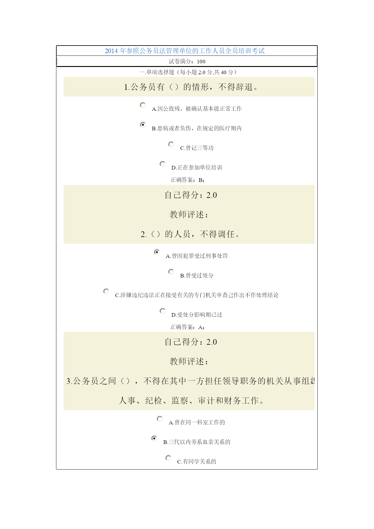 2014年参照公务员法管理单位的工作人员全员培训考试试卷满分:100一.单项选择题(每小题2.0分,共40分)1.公务员有()的情形,不得辞退。A.因公致残,被确认基本能正常工作B.患病或者负伤,在规定的医疗期内C.曾记三等功D.正在参加单位培训正确答案:B;自己得分:2.0教师评述:2.()的人员,不得调任。A.曾因犯罪受过刑事处罚B.曾受过处分C.涉嫌违纪违法正在接受有关的专门机关审查己作出不作处理结论D.受处分影响期已过正确答案:A;自己得分:2.0教师评述:3.公务员之间(),不得在其中一方担任领