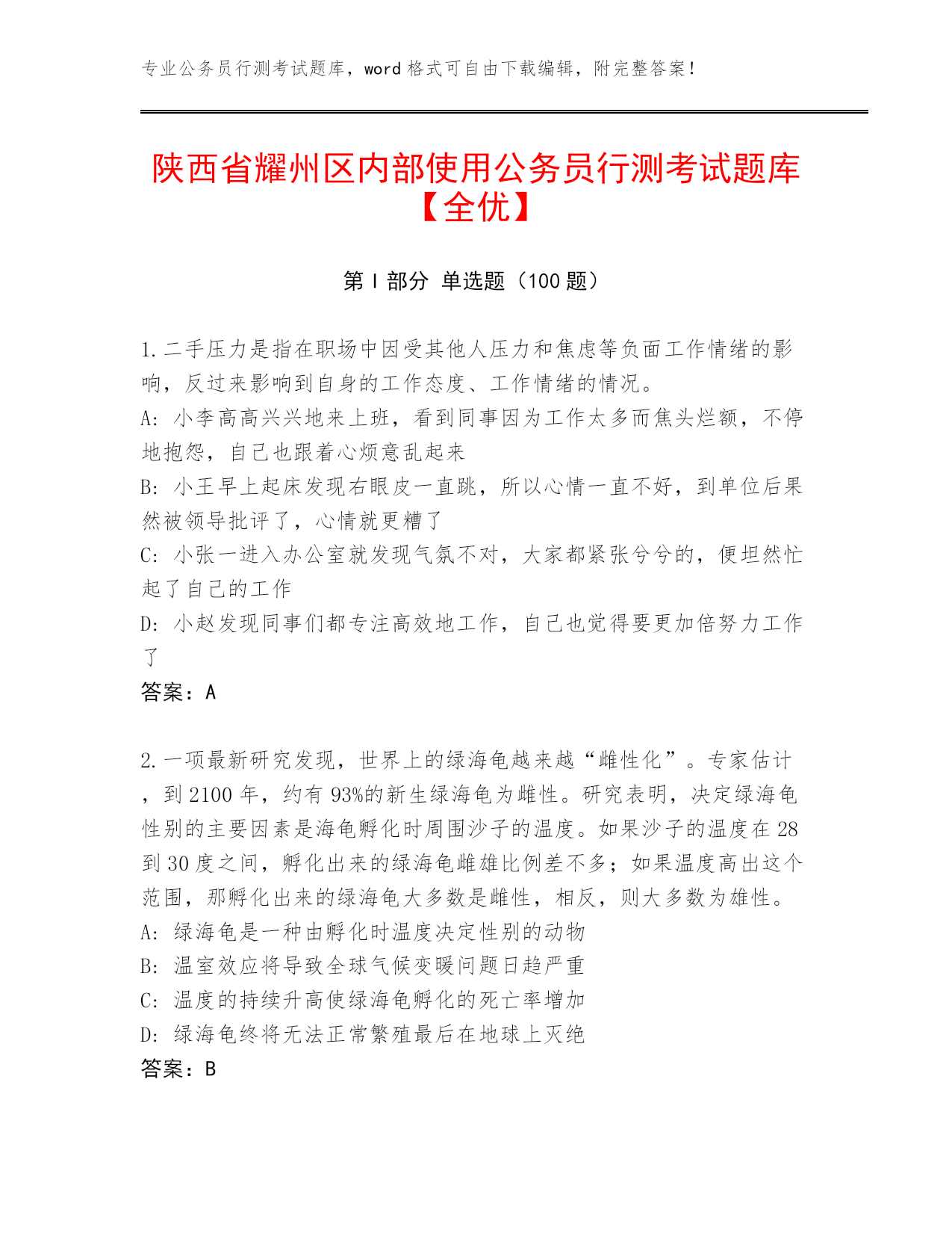 专业公务员行测考试题库,word格式可自由下载编辑,附完整答案!陕西省耀州区内部使用公务员行测考试题库【全优】第I部分单选题(100题)1.二手压力是指在职场中因受其他人压力和焦虑等负面工作情绪的影响,反过来影响到自身的工作态度、工作情绪的情况。A:小李高高兴兴地来上班,看到同事因为工作太多而焦头烂额,不停地抱怨,自己也跟着心烦意乱起来B:小王早上起床发现右眼皮一直跳,所以心情一直不好,到单位后果然被领导批评了,心情就更糟了C:小张一进入办公室就发现气氛不对,大家都紧张兮兮的,便坦然忙起了自己的工作D:小