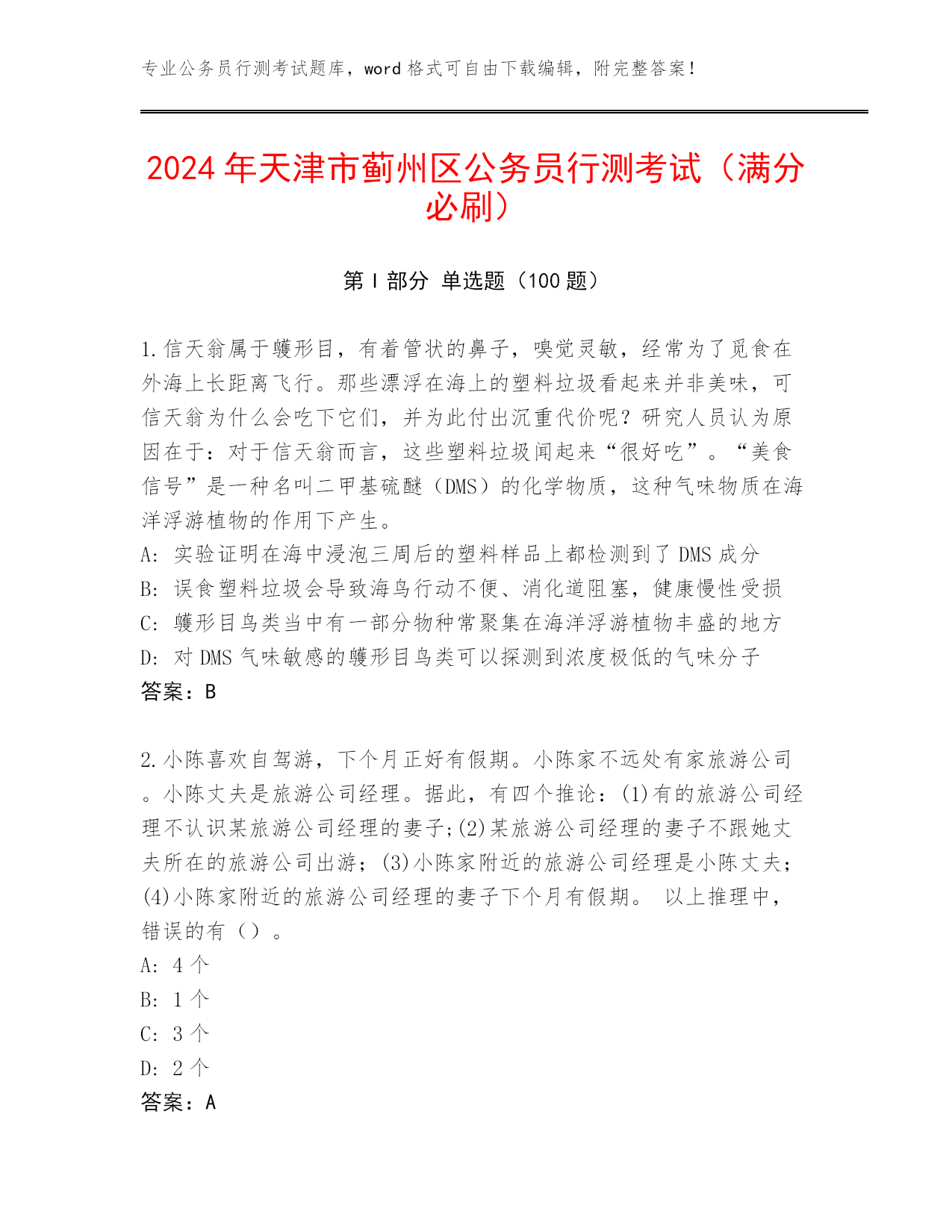 专业公务员行测考试题库,word格式可自由下载编辑,附完整答案!2024年天津市蓟州区公务员行测考试(满分必刷)第I部分单选题(100题)1.信天翁属于鹱形目,有着管状的鼻子,嗅觉灵敏,经常为了觅食在外海上长距离飞行。那些漂浮在海上的塑料垃圾看起来并非美味,可信天翁为什么会吃下它们,并为此付出沉重代价呢?研究人员认为原因在于:对于信天翁而言,这些塑料垃圾闻起来“很好吃”。“美食信号”是一种名叫二甲基硫醚(DMS)的化学物质,这种气味物质在海洋浮游植物的作用下产生。A:实验证明在海中浸泡三周后的塑料样品上都