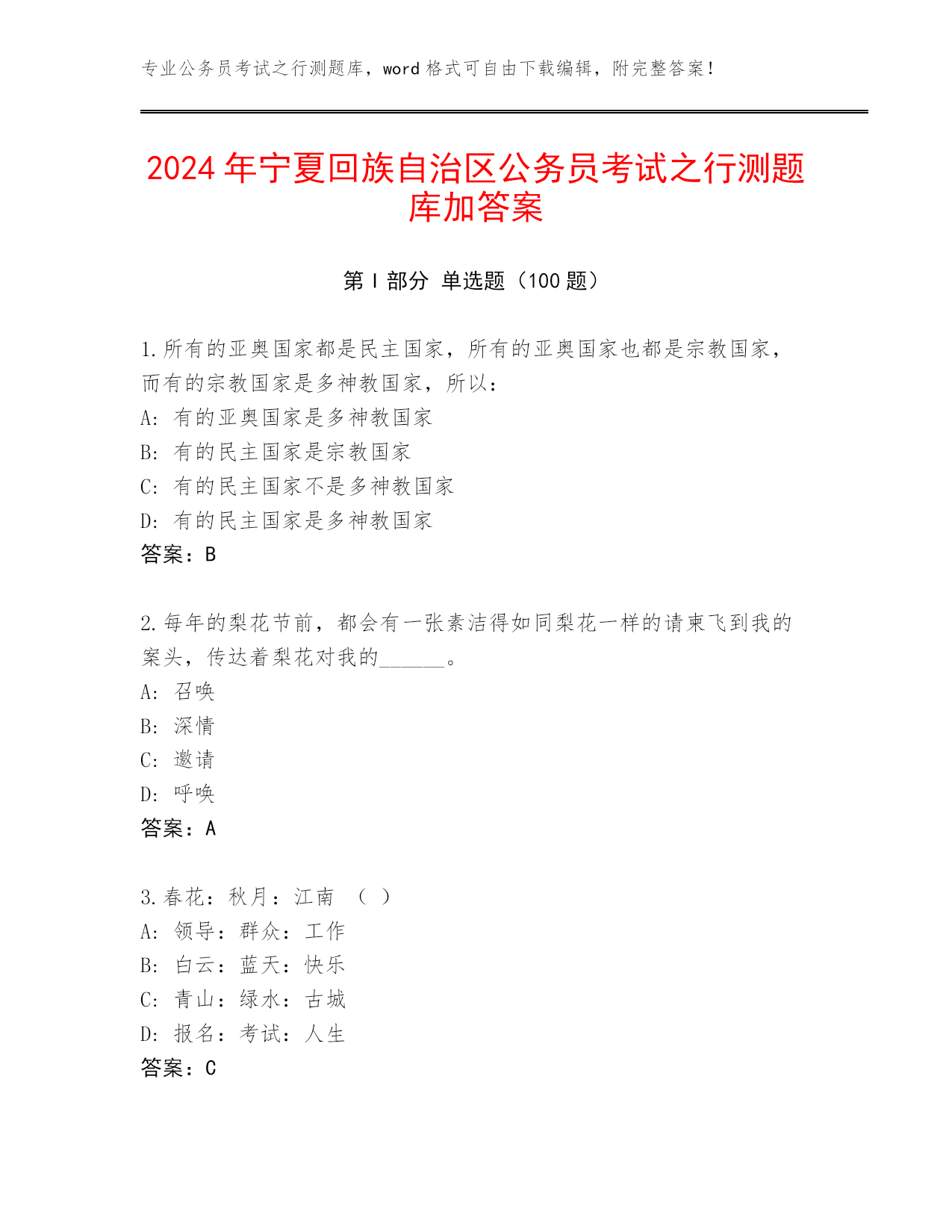专业公务员考试之行测题库,word格式可自由下载编辑,附完整答案!2024年宁夏回族自治区公务员考试之行测题库加答案第I部分单选题(100题)1.所有的亚奥国家都是民主国家,所有的亚奥国家也都是宗教国家,而有的宗教国家是多神教国家,所以:A:有的亚奥国家是多神教国家B:有的民主国家是宗教国家C:有的民主国家不是多神教国家D:有的民主国家是多神教国家答案:B2.每年的梨花节前,都会有一张素洁得如同梨花一样的请柬飞到我的案头,传达着梨花对我的______。A:召唤B:深情C:邀请D:呼唤答案:A3.春花:秋月