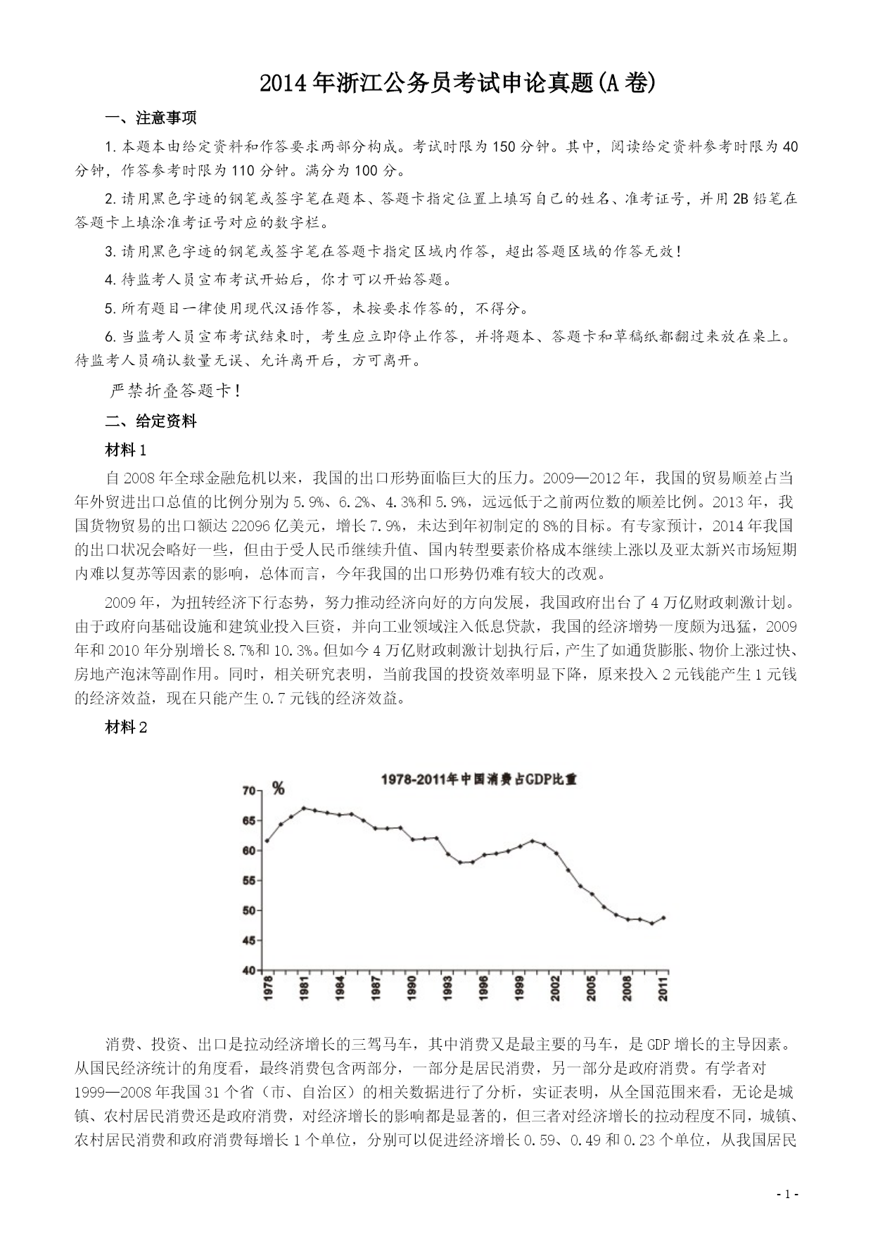 PAGE\*MERGEFORMAT-9-2014年浙江公务员考试申论真题(A卷)一、注意事项1.本题本由给定资料和作答要求两部分构成。考试时限为150分钟。其中,阅读给定资料参考时限为40分钟,作答参考时限为110分钟。满分为100分。2.请用黑色字迹的钢笔或签字笔在题本、答题卡指定位置上填写自己的姓名、准考证号,并用2B铅笔在答题卡上填涂准考证号对应的数字栏。3.请用黑色字迹的钢笔或签字笔在答题卡指定区域内作答,超出答题区域的作答无效!4.待监考人员宣布考试开始后,你才可以开始答题。5.所有题目一