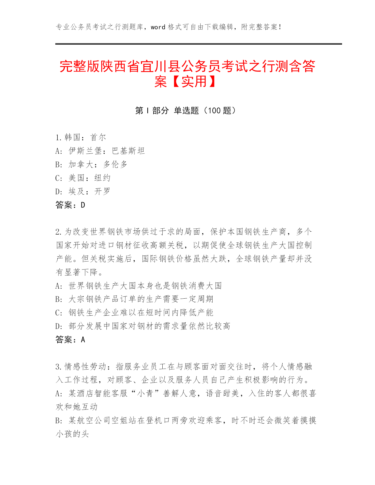 专业公务员考试之行测题库,word格式可自由下载编辑,附完整答案!完整版陕西省宜川县公务员考试之行测含答案【实用】第I部分单选题(100题)1.韩国:首尔A:伊斯兰堡:巴基斯坦B:加拿大:多伦多C:美国:纽约D:埃及:开罗答案:D2.为改变世界钢铁市场供过于求的局面,保护本国钢铁生产商,多个国家开始对进口钢材征收高额关税,以期促使全球钢铁生产大国控制产能。但关税实施后,国际钢铁价格虽然大跌,全球钢铁产量却并没有显著下降。A:世界钢铁生产大国本身也是钢铁消费大国B:大宗钢铁产品订单的生产需要一定周期C:钢铁