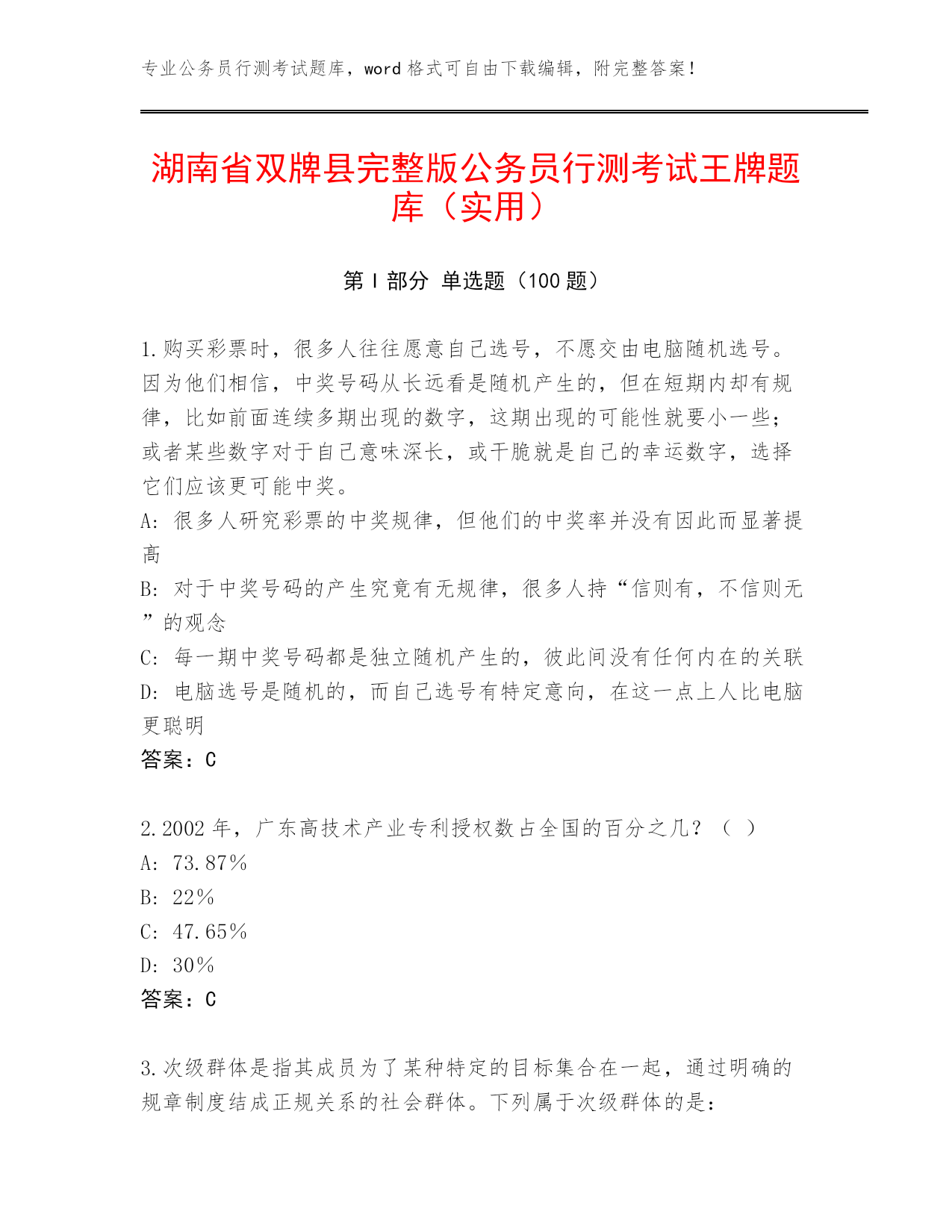 湖南省双牌县完整版公务员行测考试王牌题库(实用).docx