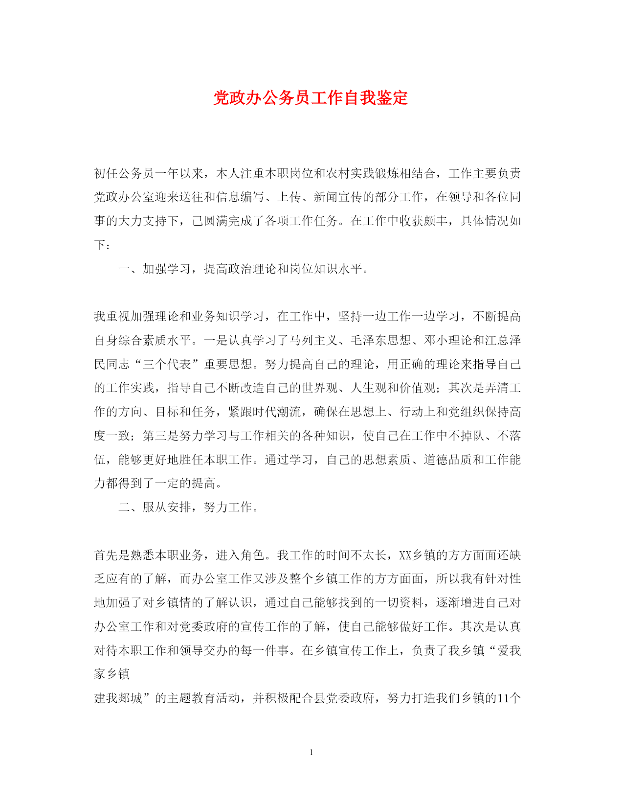 此资料由网络收集而来,如有侵权请告知上传者立即删除。资料共分享,我们负责传递知识。PAGEPAGE2党政办公务员工作自我鉴定初任公务员一年以来,本人注重本职岗位和农村实践锻炼相结合,工作主要负责党政办公室迎来送往和信息编写、上传、新闻宣传的部分工作,在领导和各位同事的大力支持下,己圆满完成了各项工作任务。在工作中收获颇丰,具体情况如下:一、加强学习,提高政治理论和岗位知识水平。我重视加强理论和业务知识学习,在工作中,坚持一边工作一边学习,不断提高自身综合素质水平。一是认真学习了马列主义、毛泽东