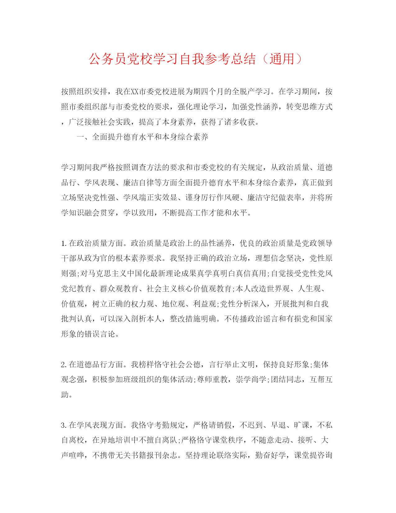 公务员党校学习自我参考总结(通用)按照组织安排,我在XX市委党校进展为期四个月的全脱产学习。在学习期间,按照市委组织部与市委党校的要求,强化理论学习,加强党性涵养,转变思维方式,广泛接触社会实践,提高了本身素养,获得了诸多收获。一、全面提升德育水平和本身综合素养学习期间我严格按照调查方法的要求和市委党校的有关规定,从政治质量、道德品行、学风表现、廉洁自律等方面全面提升德育水平和本身综合素养,真正做到立场坚决党性强、学风端正实效显、谨身厉行作风硬、廉洁守纪做表率,并将所学知识融会贯穿,学以致用,不断提高工作