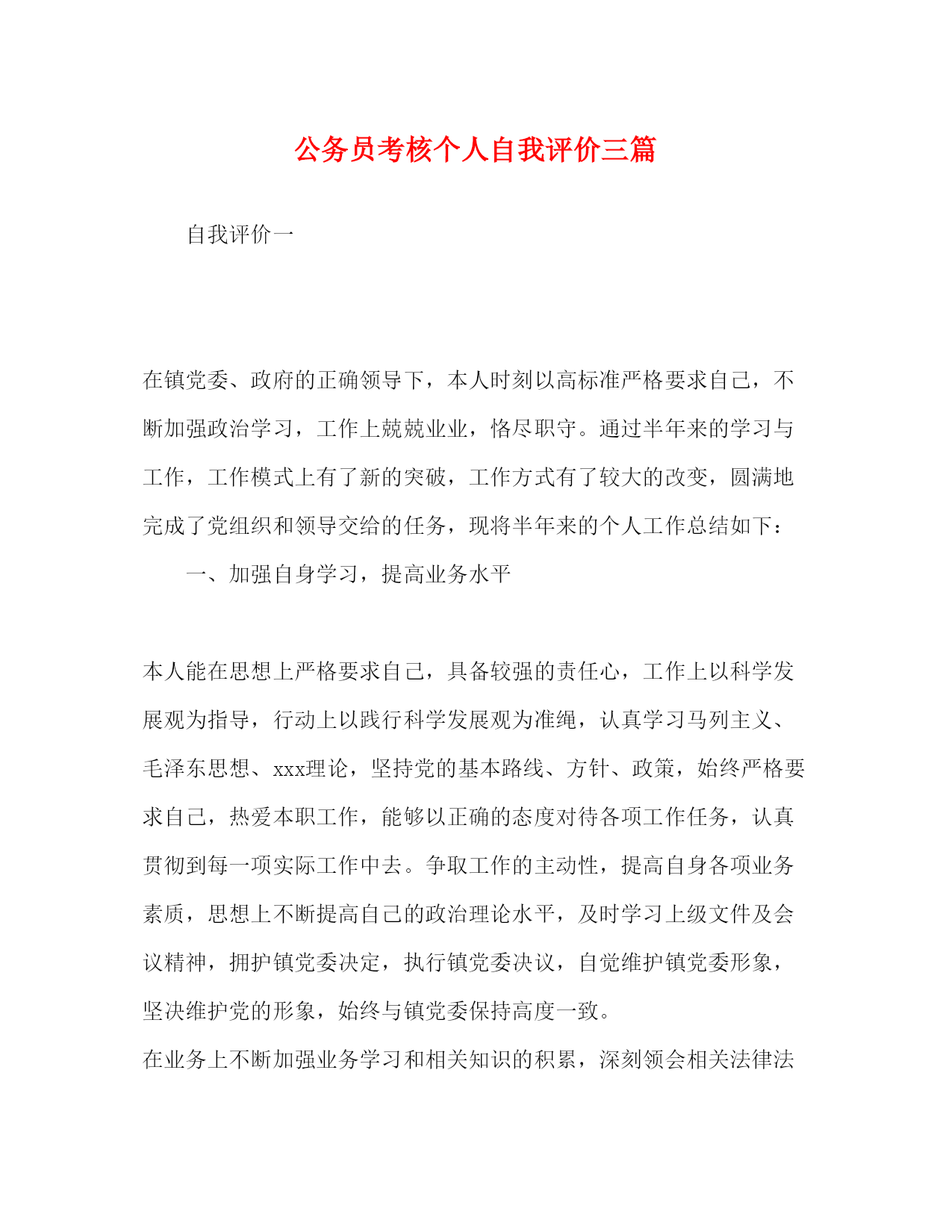 PAGE此资料由网络收集而来,如有侵权请告知上传者立即删除。资料共分享,我们负责传递知识。公务员考核个人自我评价三篇自我评价一在镇党委、政府的正确领导下,本人时刻以高标准严格要求自己,不断加强政治学习,工作上兢兢业业,恪尽职守。通过半年来的学习与工作,工作模式上有了新的突破,工作方式有了较大的改变,圆满地完成了党组织和领导交给的任务,现将半年来的个人工作总结如下:一、加强自身学习,提高业务水平本人能在思想上严格要求自己,具备较强的责任心,工作上以科学发展观为指导,行动上以践行科学发展观为准绳,认真学
