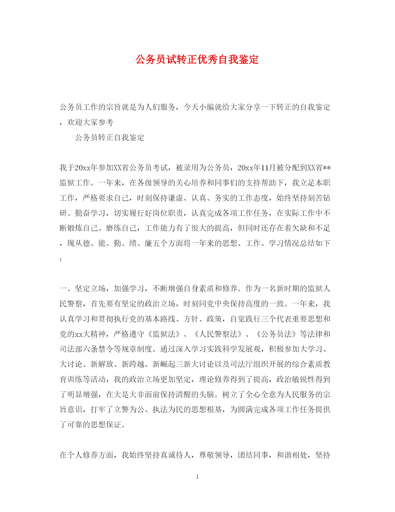此资料由网络收集而来,如有侵权请告知上传者立即删除。资料共分享,我们负责传递知识。PAGEPAGE6公务员试转正优秀自我鉴定公务员工作的宗旨就是为人们服务,今天小编就给大家分享一下转正的自我鉴定,欢迎大家参考公务员转正自我鉴定我于20xx年参加XX省公务员考试,被录用为公务员,20xx年11月被分配到XX省**监狱工作。一年来,在各级领导的关心培养和同事们的支持帮助下,我立足本职工作,严格要求自己,时刻保持谦虚、认真、务实的工作态度,始终坚持刻苦钻研、勤奋学习,切实履行好岗位职责,认真完成各项