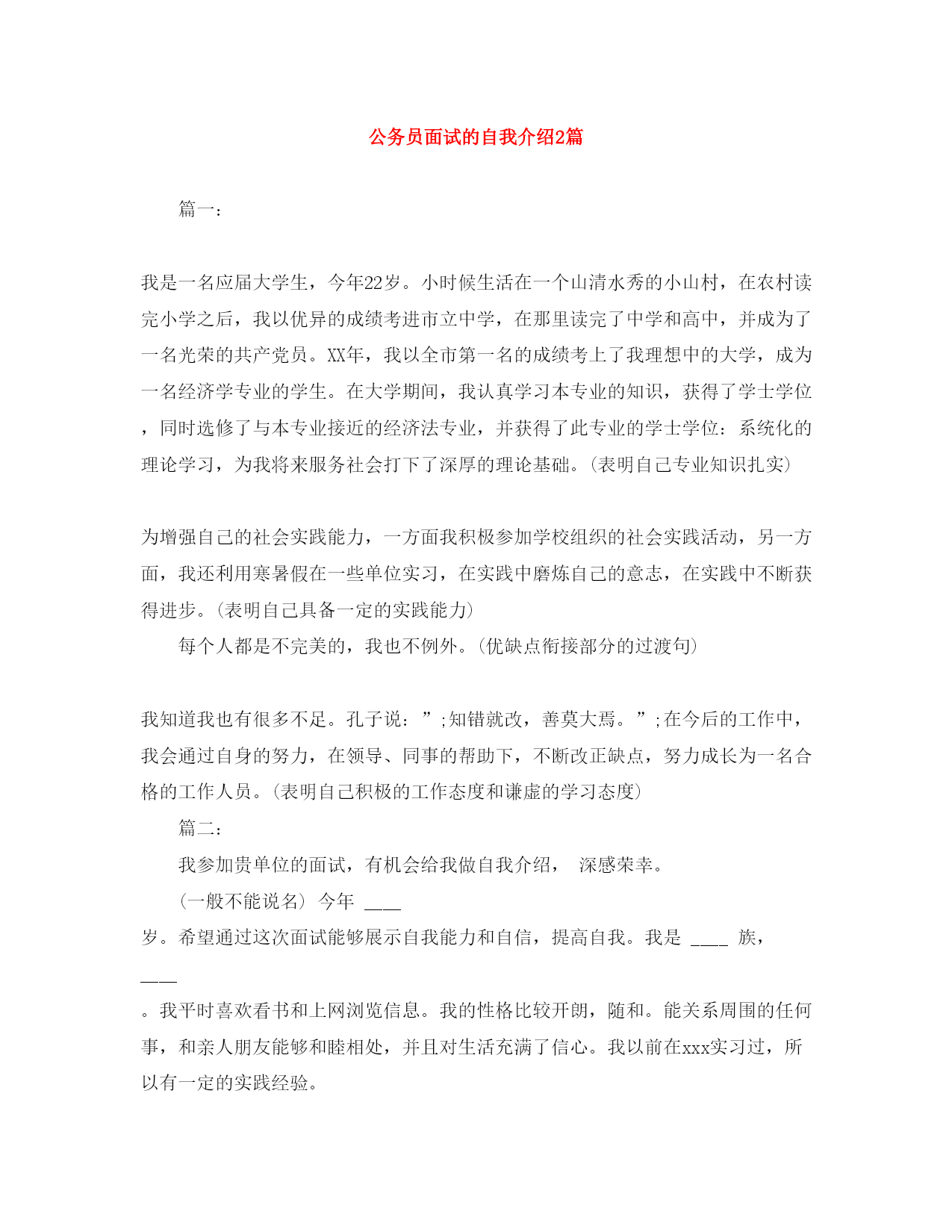 此资料由网络收集而来,如有侵权请告知上传者立即删除。资料共分享,我们负责传递知识。公务员面试的自我介绍2篇篇一:我是一名应届大学生,今年22岁。小时候生活在一个山清水秀的小山村,在农村读完小学之后,我以优异的成绩考进市立中学,在那里读完了中学和高中,并成为了一名光荣的共产党员。XX年,我以全市第一名的成绩考上了我理想中的大学,成为一名经济学专业的学生。在大学期间,我认真学习本专业的知识,获得了学士学位,同时选修了与本专业接近的经济法专业,并获得了此专业的学士学位:系统化的理论学习,为我将来服务社会打下了深