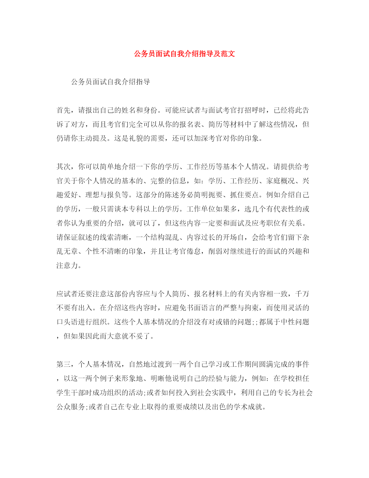 此资料由网络收集而来,如有侵权请告知上传者立即删除。资料共分享,我们负责传递知识。公务员面试自我介绍指导及范文公务员面试自我介绍指导首先,请报出自己的姓名和身份。可能应试者与面试考官打招呼时,已经将此告诉了对方,而且考官们完全可以从你的报名表、简历等材料中了解这些情况,但仍请你主动提及。这是礼貌的需要,还可以加深考官对你的印象。其次,你可以简单地介绍一下你的学历、工作经历等基本个人情况。请提供给考官关于你个人情况的基本的、完整的信息,如:学历、工作经历、家庭概况、兴趣爱好、理想与报负等。这部分的陈述务必简