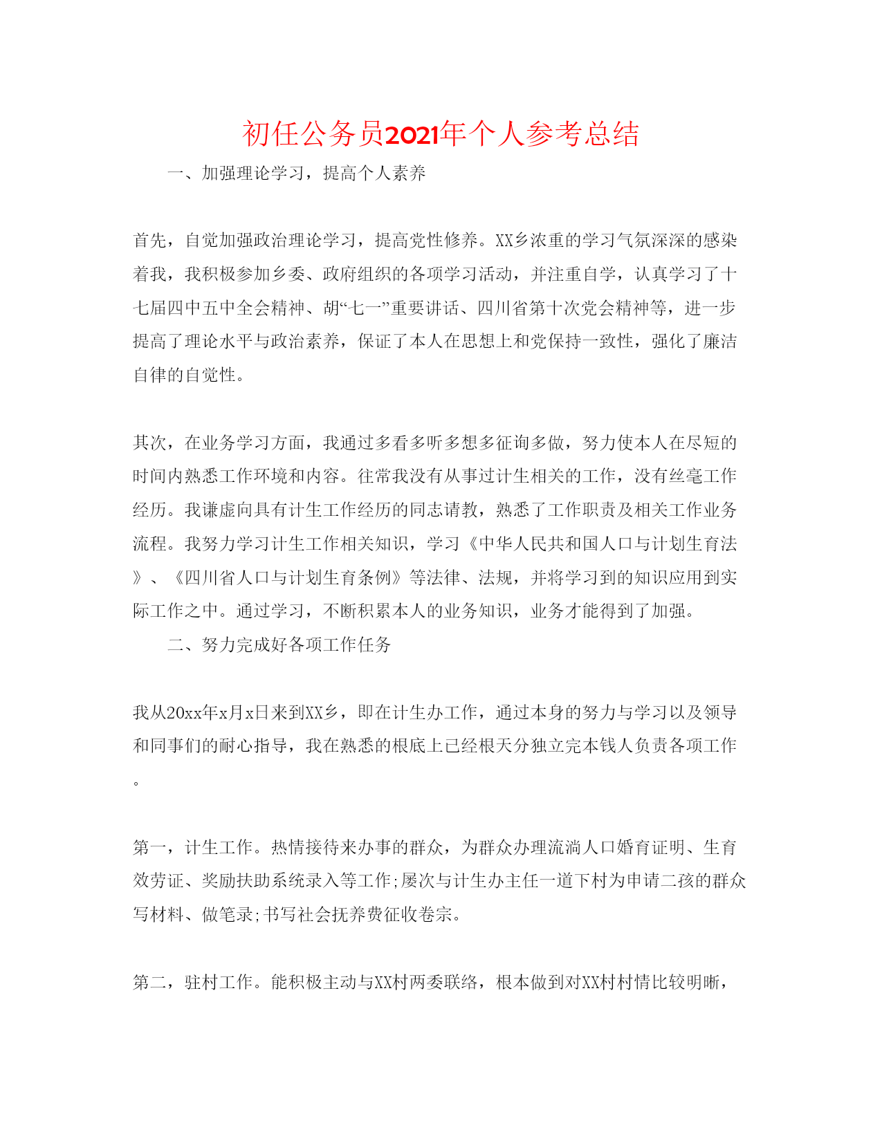 初任公务员2021年个人参考总结一、加强理论学习,提高个人素养首先,自觉加强政治理论学习,提高党性修养。XX乡浓重的学习气氛深深的感染着我,我积极参加乡委、政府组织的各项学习活动,并注重自学,认真学习了十七届四中五中全会精神、胡“七一”重要讲话、四川省第十次党会精神等,进一步提高了理论水平与政治素养,保证了本人在思想上和党保持一致性,强化了廉洁自律的自觉性。其次,在业务学习方面,我通过多看多听多想多征询多做,努力使本人在尽短的时间内熟悉工作环境和内容。往常我没有从事过计生相关的工作,没有丝毫工作经历。我谦