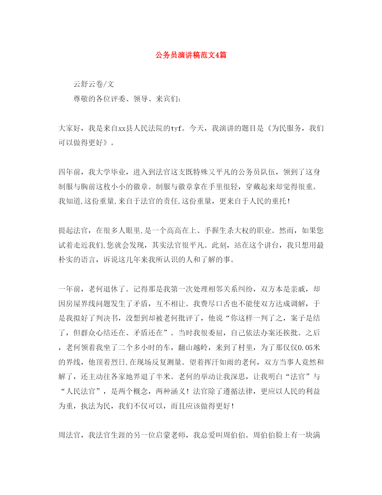 此资料由网络收集而来,如有侵权请告知上传者立即删除。资料共分享,我们负责传递知识。公务员演讲稿范文4篇云舒云卷/文尊敬的各位评委、领导、来宾们:大家好,我是来自xx县人民法院的tyf。今天,我演讲的题目是《为民服务,我们可以做得更好》。四年前,我大学毕业,进入到法官这支既特殊又平凡的公务员队伍,领到了这身制服与胸前这枚小小的徽章。制服与徽章拿在手里很轻,穿戴起来却觉得很重。我知道,这份重量,来自于法官的责任,这份重量,更来自于人民的重托!提起法官,在很多人眼里,是一个高高在上、手握生杀大权的职业。然而,如