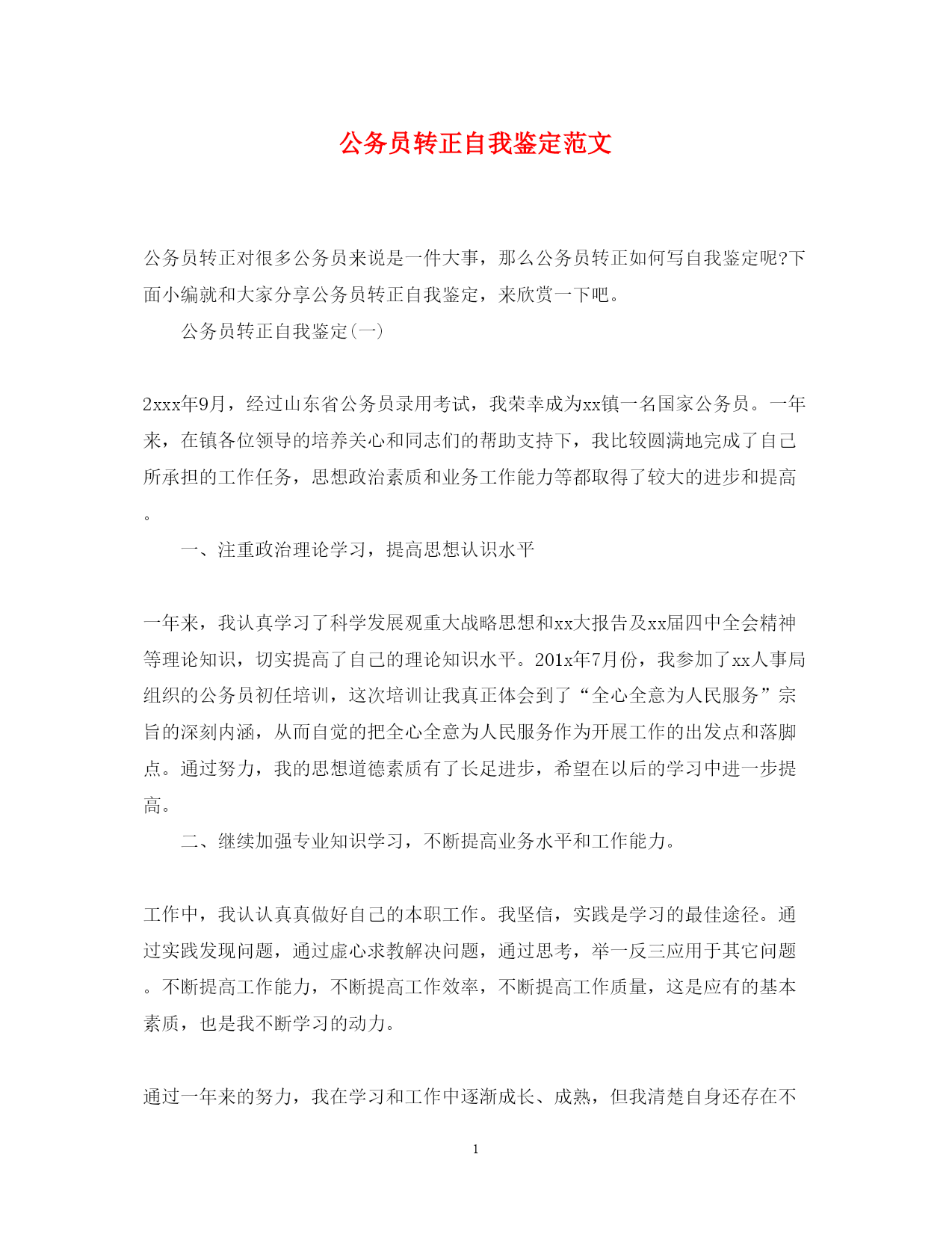 此资料由网络收集而来,如有侵权请告知上传者立即删除。资料共分享,我们负责传递知识。PAGEPAGE5公务员转正自我鉴定范文公务员转正对很多公务员来说是一件大事,那么公务员转正如何写自我鉴定呢?下面小编就和大家分享公务员转正自我鉴定,来欣赏一下吧。公务员转正自我鉴定(一)2xxx年9月,经过山东省公务员录用考试,我荣幸成为xx镇一名国家公务员。一年来,在镇各位领导的培养关心和同志们的帮助支持下,我比较圆满地完成了自己所承担的工作任务,思想政治素质和业务工作能力等都取得了较大的进步和提高。一、注重