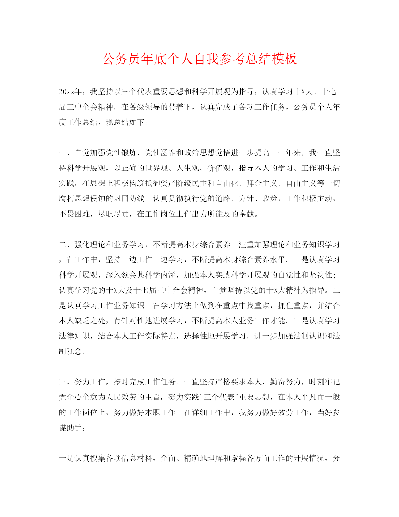 公务员年底个人自我参考总结模板20xx年,我坚持以三个代表重要思想和科学开展观为指导,认真学习十X大、十七届三中全会精神,在各级领导的带着下,认真完成了各项工作任务,公务员个人年度工作总结。现总结如下:一、自觉加强党性锻炼,党性涵养和政治思想觉悟进一步提高。一年来,我一直坚持科学开展观,以正确的世界观、人生观、价值观,指导本人的学习、工作和生活实践,在思想上积极构筑抵御资产阶级民主和自由化、拜金主义、自由主义等一切腐朽思想侵蚀的巩固防线。认真贯彻执行党的道路、方针、政策,工作积极主动,不畏困难,尽职尽责,