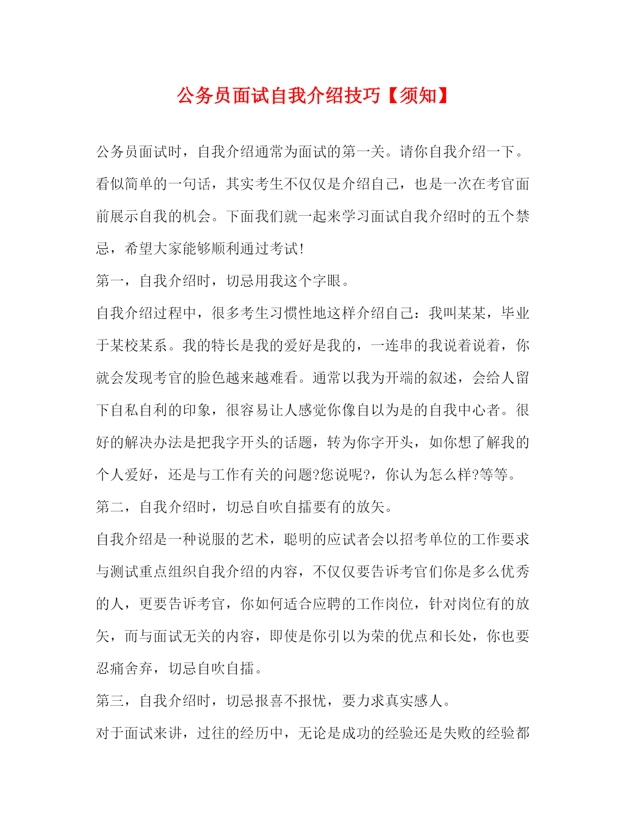 PAGE此资料由网络收集而来,如有侵权请告知上传者立即删除。资料共分享,我们负责传递知识。公务员面试自我介绍技巧【须知】公务员面试时,自我介绍通常为面试的第一关。请你自我介绍一下。看似简单的一句话,其实考生不仅仅是介绍自己,也是一次在考官面前展示自我的机会。下面我们就一起来学习面试自我介绍时的五个禁忌,希望大家能够顺利通过考试!第一,自我介绍时,切忌用我这个字眼。自我介绍过程中,很多考生习惯性地这样介绍自己:我叫某某,毕业于某校某系。我的特长是我的爱好是我的,一连串的我说着说着,你就会发现考官的脸色