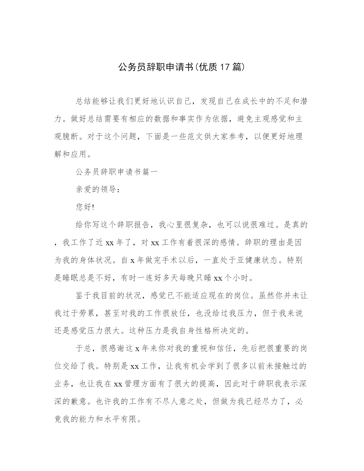 公务员辞职申请书(优质17篇)总结能够让我们更好地认识自己,发现自己在成长中的不足和潜力。做好总结需要有相应的数据和事实作为依据,避免主观感觉和主观臆断。对于这个问题,下面是一些范文供大家参考,以便更好地理解和应用。公务员辞职申请书篇一亲爱的领导:您好!给你写这个辞职报告,我心里很复杂,也可以说很难过。是真的,我工作了近xx年了,对xx工作有着很深的感情。辞职的理由是因为我的身体状况。自x年做完手术以后,一直处于亚健康状态。特别是睡眠总是不好,有时一连好多天每晚只睡xx个小时。鉴于我目前的状况,感觉已不能